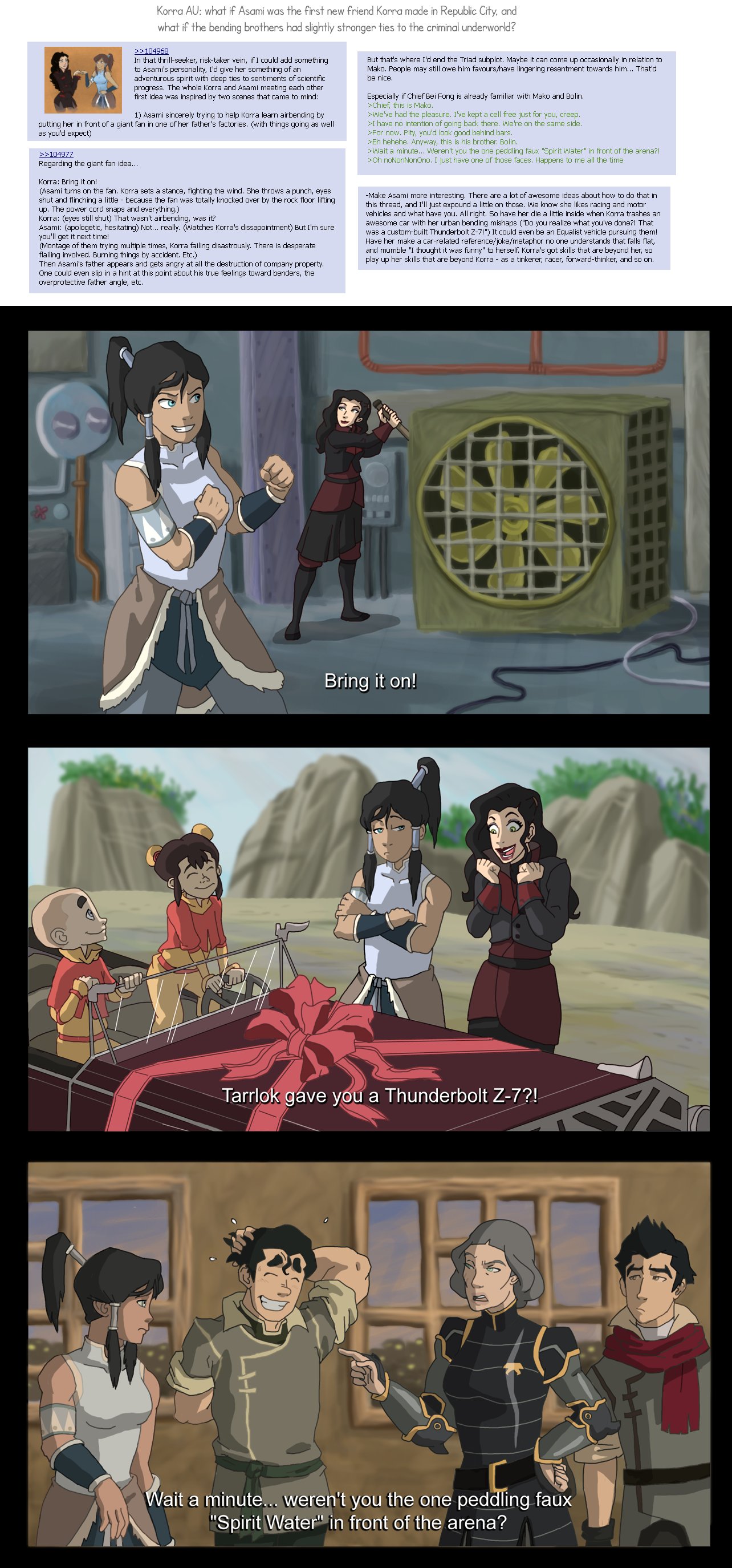 -Someone on /co/ suggested that the story would actually make more sense if the personalities of the brothers were switched. What if Amon was the emotional, sensitive kid while Tarrlok was the cold, distant one? Tarrlok would stay with Yakone and grow power-hungry like his father, whereas Amon would be horrified by the concept of bloodbending and he would leave. Maybe he'd settle down and have a family. But one day he ends up in a situation where he has to protect himself by bloodbending some firebender. That bender gathers up his gang in revenge, they kill Amon's family and scar him. Amon would in his grief come to the conclusion that all bending is evil; he had tried to escape his heritage, and he only tried to protect himself, but all he got was pain. So, he learns a way to use bloodbending for blocking chakras and spends some years travelling the world and de-bending outlaws, until he settles for Republic City.