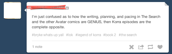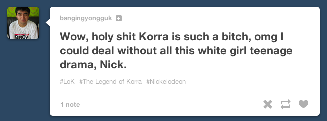 And worse, because people have put this label on Korra, they feel unjustly betrayed by the show, because she's not exactly as people would like a feminist icon to be (whatever that is, it varies from wave to wave).