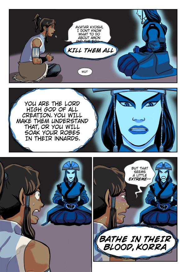 Now i am thinking of that comic strip where Korra consults Kiyoshi and she tells her to kill all her enemies and bathe in their blood.