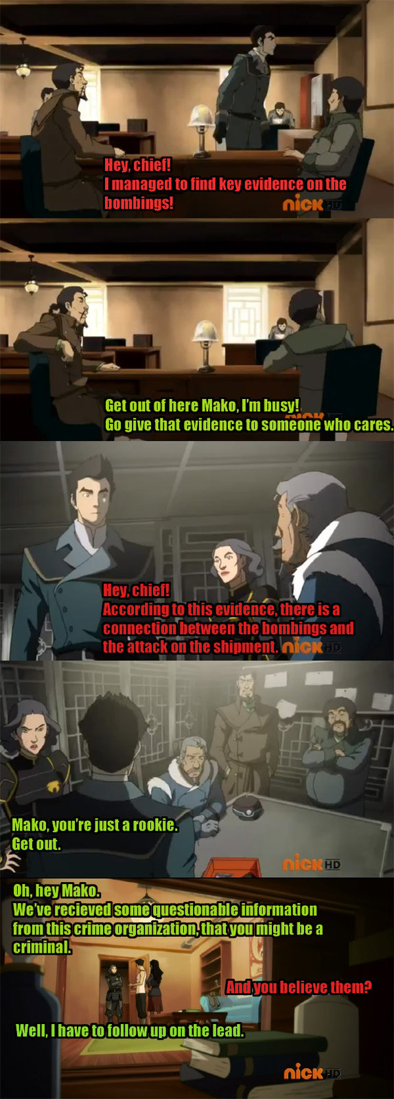 Both plots are bound together via the civil war, but it's a tenuous connection at this point, as the war is happening off-screen, and doesn't seem to matter to the Republic City B-plot cast except as a means to an end. When the Republic City cast got transplanted outside their native setting, to the South Pole for the opening four episodes, it wasn't the greatest thing as they had little to do: Bolin got shackled to an arguably funny crazy girlfriend, Mako played the token love interest to Korra, and Asami outright vanished for two episodes because she only existed to facilitate Varrick's introduction.