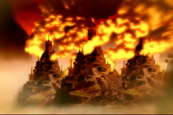 Just as things seem about set, a sudden earth tremor begins as the top of the mountain explodes. As the circus people nearby begin to scatter and panic, we see scenes of how the earthquake is affecting the area (including that scene mentioned above where the two young Fire Nation guys who were arrested for treasonous talk escape their jail cell because the quake made the wall collapse). Pillows of smoke begin to race down the mountain side and lava bursts forth from crevices. Mai and Ty Lee tell Aang they should get away immediately, but Aang looks back at the panicy circus and then at Azula and the others lying helpless on the ground and says they can't just leave them. Though Mai insists they don't have time and that there's nothing they can do except save their own hides, Aang picks Azula, who yells at him not to touch her, and airbends her limp body onto Appa's back. Aang, Mai and Ty Lee load the other soldiers with her as well. Aang tells Appa to take them away. When Ty Lee asks Aang what he plans to do, he says that maybe he can buy the people at the circus some more time, but tells them Appa should be able to take them somewhere safe. Aang takes his glider back and flies to where the smoke pillows are coming down towards the circus. Aang attempts to use his Airbending to its fullest to hold back the toxic smoke and cool off the lava, but it all seems to be in vain until the minute he himself becomes engulfed, as we see him in the smoke, coughing and struggling to breathe, his eyes and tattoos start to glow. Mai and Ty Lee, who are watching from the sky as they fly away on Appa, think that Aang is a goner. Azula, peeking over, laughs at his failure and says that it looks like the two "became traitors all for nothing," telling them also not to think that just because Aang's done for that this means she's gonna go any easier on them for what they did. At that moment, they see the bright glow of Aang in his Avatar State. Aang uses his increased power in the Avatar State to gather all the smoke in the area around him in a twister shape beneath him (obscuring his legs) as he shoots into the air. In the AS, he also bends both the lava and water from a nearby stream or river around him (similar to what he did with the water while in the AS in the canon episode 2). He uses the water to cool off the lava, creating a tall coiling pillar of cooled volcanic rock while at the same time gathering all the smoke and effectively cleansing it of its toxins and heat. The circus people and Mai and Ty Lee in the distance are totally mesmerized by what they've seen. When Azula sees this, she points out that Aang is in fact the Avatar, wondering how that's possible ('I-It can't be! That's impossible! That little brat's the Avatar? The master of all four elements?') Mai and Ty Lee look at each other equally surprised at this realization. When the bulk of the eruption appears to have subsided, Mai stomps her foot on Appa's head and orders him to take them down. After they land, Mai and Ty Lee toss Azula and the other soldiers off Appa onto the ground. Azula tells them that they're fools without a clue what they're doing. Before they take off to go get Aang, Mai stops Ty Lee and tells her that Azula might have a point and that if they choose to leave with Aang now, they might not ever have a chance to come back. Mai also says that if Aang IS the Avatar and was hiding it from them the whole time, how do they know they can trust him to be telling them the truth? Ty Lee pauses for a minute and then tells Mai that since they found Aang, she knew there was something special about him and that she always knew by that the universe had something special planned for her. That was why, she says, she joined the circus in the first place because she felt it was her calling, but now "I can't help but feel like Aang is calling a little louder." If Aang is the Avatar, she goes on, maybe all of the events of their lives have been leading up to this moment, maybe they were meant to become friends with Aang and maybe the reason she was supposed to join the circus was to eventually find Aang under the mountain. Perhaps if they go with Aang now, Ty Lee finishes, she can find out where she is meant to be and, maybe BOTH of them can, she adds. Mai doesn't say anything, but after looking into Ty Lee's mixed sad/happy expression, she shrugs and just say "Well, better than staying here and dealing with Azula." Ty Lee gives Mai a big hug, which causes her to tense up for a moment, but Mai returns it. Mai makes a funny face that looks as if she's thinking "What have I gotten into?" As they take off, Azula screams at them that she'll track them wherever they hide, and with the Chi-Blocking starting to wear off, spits out blue flames from her mouth in rage.