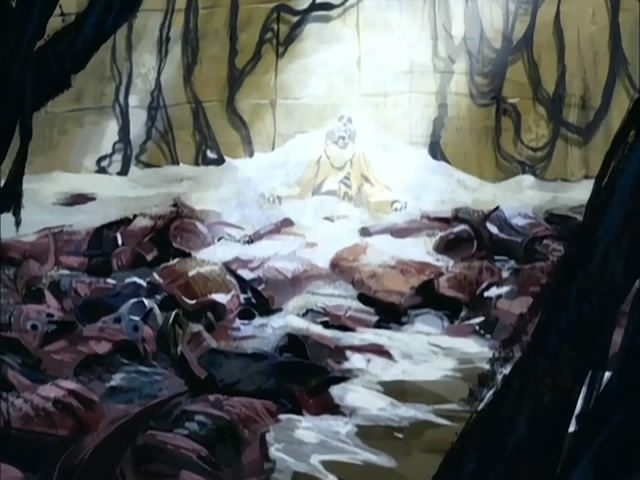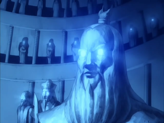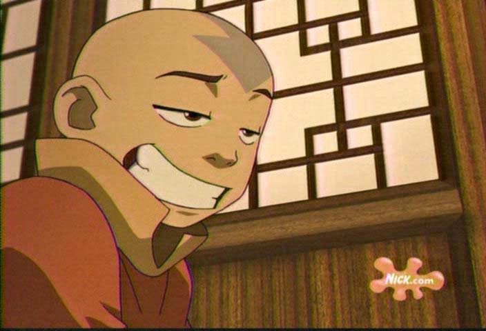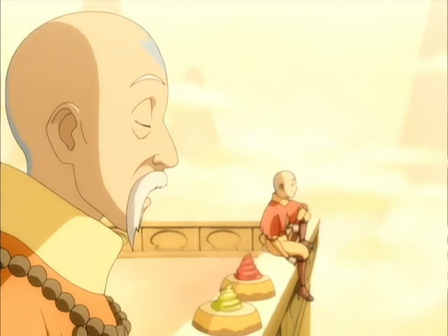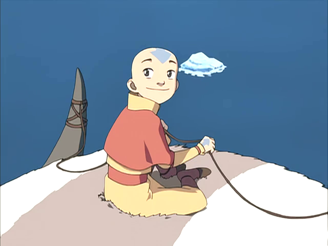 We cut to Aang curled up on top of the coiled pillar of rock he's created, sulking as he holds his glider and the circus folk stare up at him. He sees Appa with Mai and Ty Lee on top coming into view. They tell him to hop on. Aang is happy to see that they're alright and leaps on Appa's head as he flies away. We skip a little ahead to see Aang holding the reigns of Appa as he flies over the water. Ty Lee is chatting up a storm about how amazing Aang was. Aang blushes a little, but just gives a quiet thank you to Ty Lee for her complements. Mai interrupts Ty Lee and standing over Aang, casting her shadow on him, demands to know why he didn't tell them he was the Avatar earlier and also demands to know what else he's hiding from them. Aang turns his face forward, refraining from eye contact with Mai has he pilots the sky bison and just says in sad voice "I'm sorry I didn't tell you that before, but I didn't want you guys to know cause...I never wanted to be the Avatar." End episode.