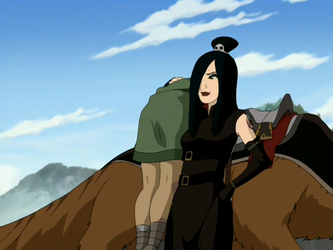 Azula, meanwhile, boasts that Aang, as destiny ordained, has been defeated by Fire nation like other Airbenders before him. A brief conversation happens between the two as Azula mocks Aang as an example of why his people had no chance against the Fire Nation, but she also tells him that he can make things easier for himself IF he gives her information on where she might find the Avatar since if someone as young as Aang is still alive, there must be more Airbenders around somewhere and if there are still Airbenders alive and the Avatar hasn't been born into either the Water Tribe or Earth Kingdom, then the Avatar must still be among their ranks. Aang hesitates to answer and just looks at Mai, whose eyes look away. It almost looks like Mai feels ashamed of what she's done, but the emotion on her face isn't strong enough to really express it fully. When Aang refuses to answer her, Azula shrugs and says it doesn't matter since she has "plenty of other ways to make him talk." As the soldiers prepare to lift Aang up and take him away, Ty Lee suddenly shows up and subdues them, displaying her Chi-Blocking skills before Aang for the first time. Both Mai and Aang are stupefied. Once Ty Lee makes quick work of the platoon, she stands between Mai and Aang, attempting to reason with Azula and tell her in her own naive way that Aang is not an enemy and says that if Azula would only give him a chance like they did, she'd realize that, Airbender or not, Aang is a friend. Azula tells Ty Lee to quit with her childish nonsense and warns her that what she's doing amounts to treason. Ty Lee refuses to back down at Azula's command, so an upset Azula begins putting her down and yells at Mai to arrest her as well. Mai walks up to them menacingly appearing like she's going to comply without question. Ty Lee gulps and prepares herself to fight her, but Mai surprises everyone by pulling out one of her knives and cutting the ropes that bind Aang and saying to them that they should get going. Azula freaks out and asks what she's doing? Mai turns around and explains to Azula calmly, but in a pretty smart aleky tone, about how she "miscalculated" how much fear she strikes into Mai herself. The gloomy girl tops this her short speech off with how much Azula's personality and following her around like a dog bores her and besides, the way Azula described being a traitor "sounds like it could be nice change of pace," in her dull life. Azula, naturally, is furious and shows off her skills at bending lightning for the first time. Thanks to a now free Aang, the three just barely evade Azula's bolts long enough for Ty Lee to get close enough to block her chi. When all is said and done, Mai tells Aang he needs to get moving before Ty Lee's chi blocking wears off. At this point, Appa shows up right on cue, having sensed Aang was in trouble. Aang thanks his new friends for what they've done for him but tells them they didn't have to since now they're in trouble because of him. Mai scoffs at Aang again to not be so full of himself, crossing her arms and looking away. Aang just smiles and prepares to leave, but just as he does so, Ty Lee asks where he will go. Aang says that he'll probably head back home like he originally planned to which Ty Lee begs to come with him. Mai and Aang are taken back by the suggestion, to which Ty Lee explains that there isn't very much else they can do now except wait to be arrested and that it might be more fun to see the Air Temple where Aang comes from. Azula, who is still struggling to pull numb body off the ground, shouts at three that no matter where they go she'll find them and make them suffer for their insubordination. Mai groans and says if it'll get her out of this dump and away from Azula's yelling, she's willing to go anywhere ('I doubt my parents'll notice I'm gone anyway').