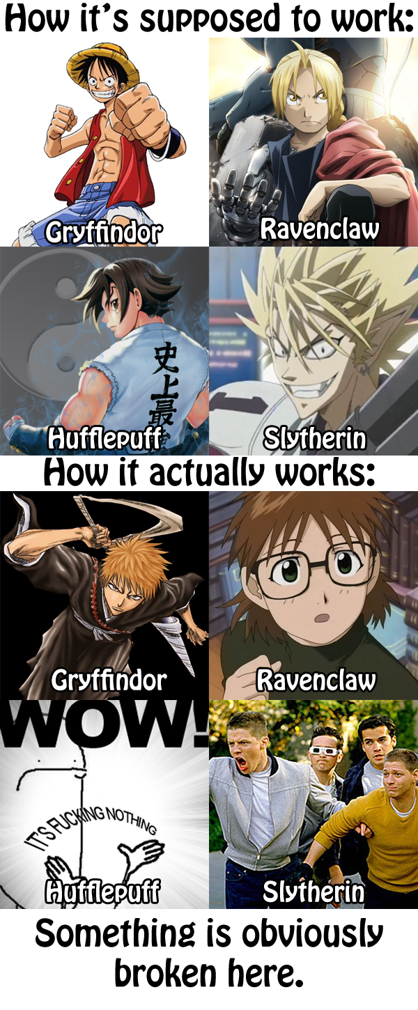 What we ended up with was Gryffindor being the house with every last protagonist and big damn hero (thus the comparison to Ichigo, a recent example of a protagonist who has the story revolve around them) Ravenclaws were just nerds who weren't that useful, Hufflepuffs were the same, minus the smarts or any important characters (except Cedric Diggory, who dies) and the Slytherins were just nothing but the jocks and bullies, and in the end every single one of them sided with Voldemort.