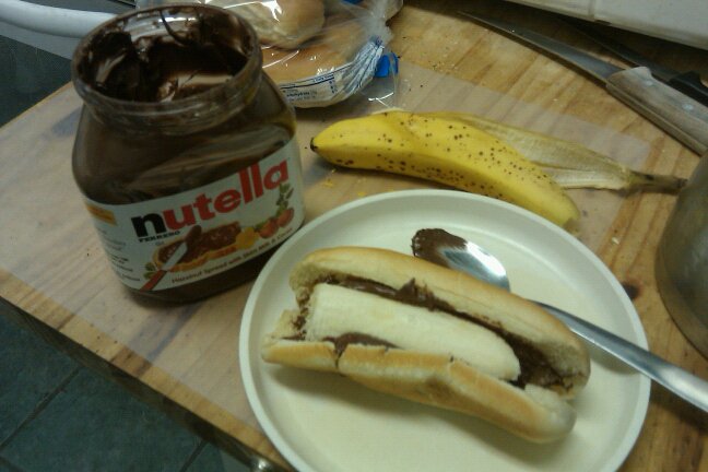 I have a vision of a sandwich. In this sandwich is peanut butter, nutella, and banana slices. The sandwich is dipped in batter, deep-fried, and topped with sliced strawberries and chocolate ice cream.