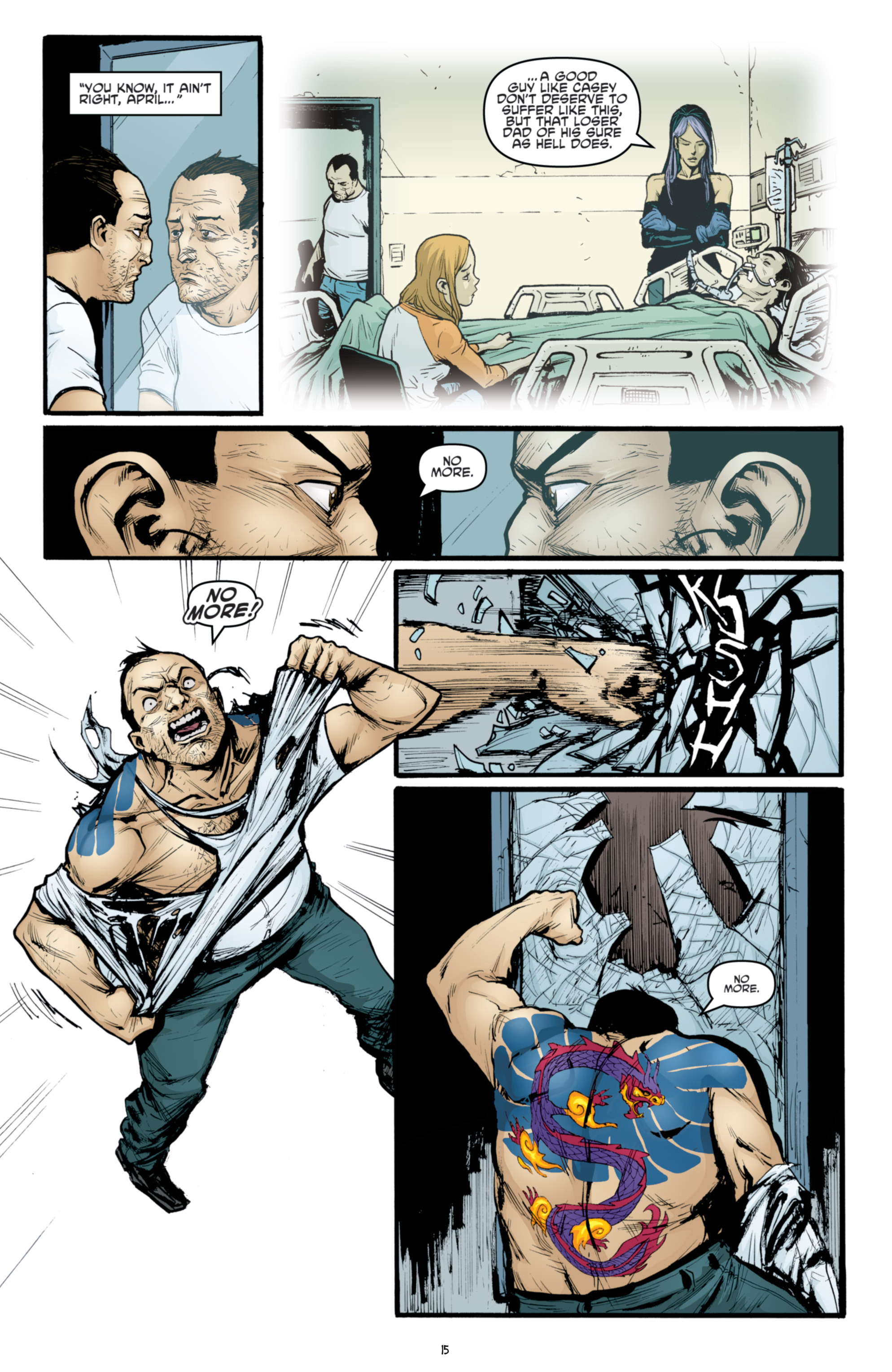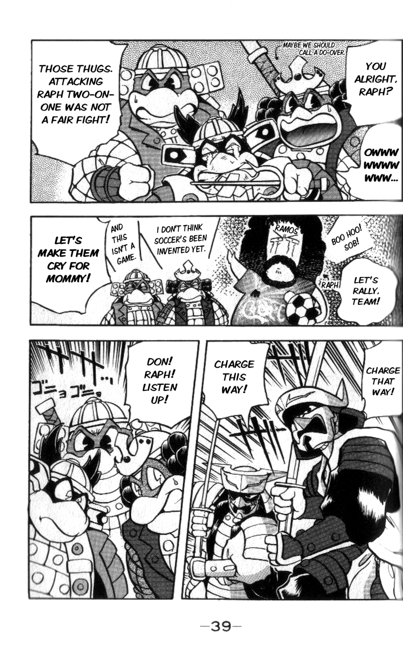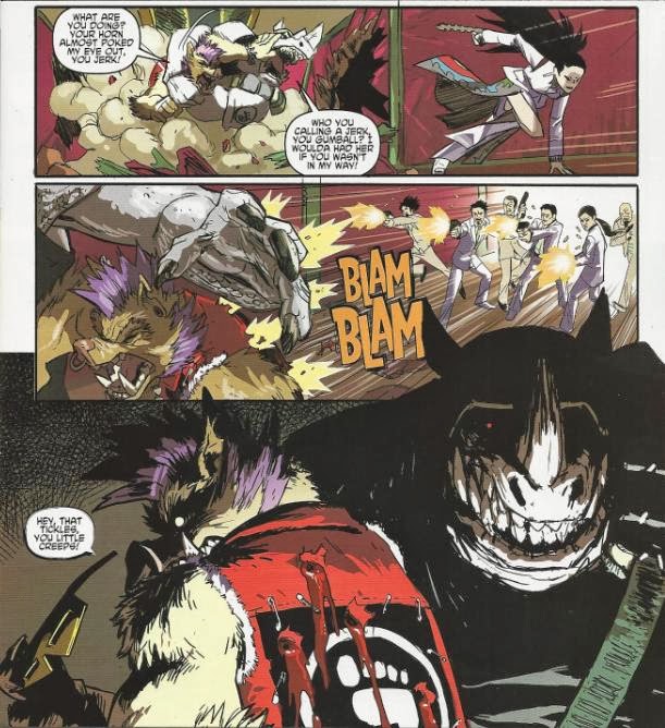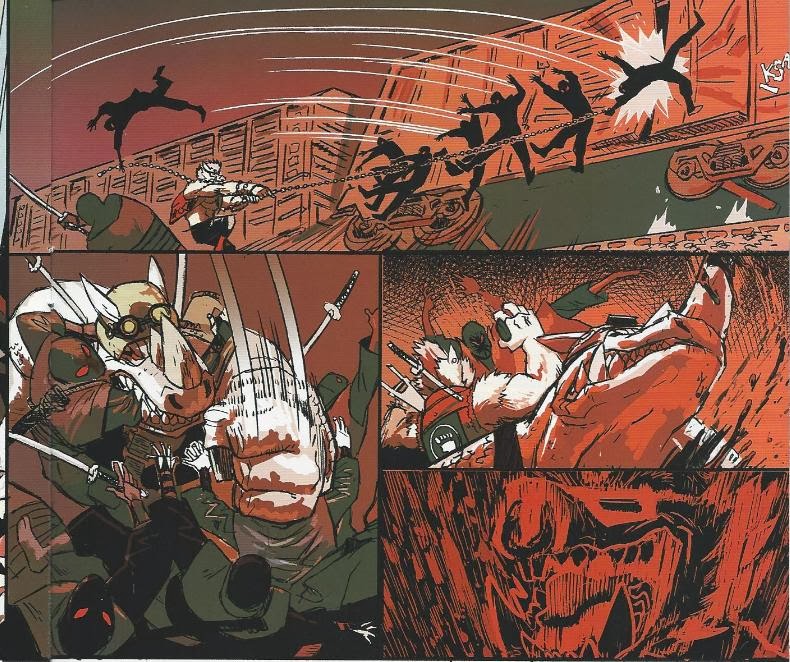 Would be nice if the TMNT cartoon could do violence like this, no? Its just right. Really love the page showing them with battle wounds at the end after crushing those Foot Ninjas with weapons sticking from them showing how resilient they've become to pain.