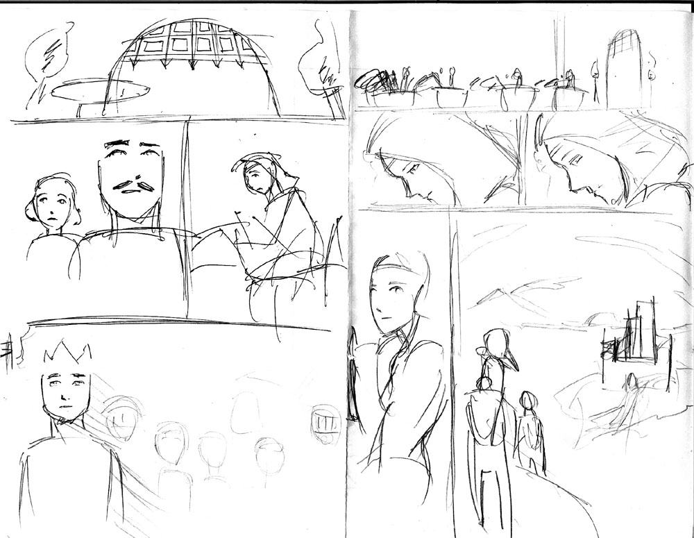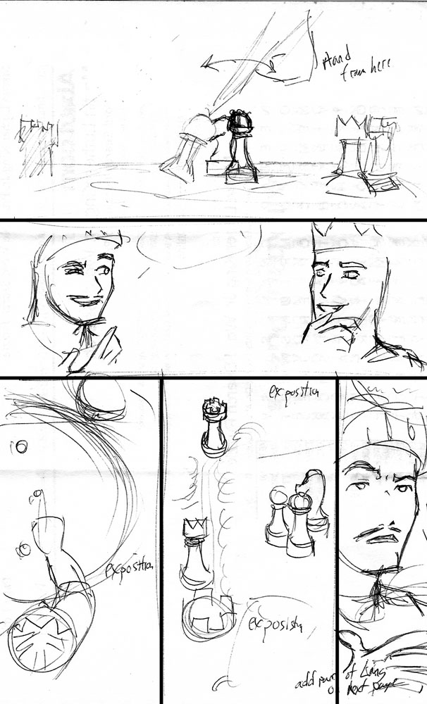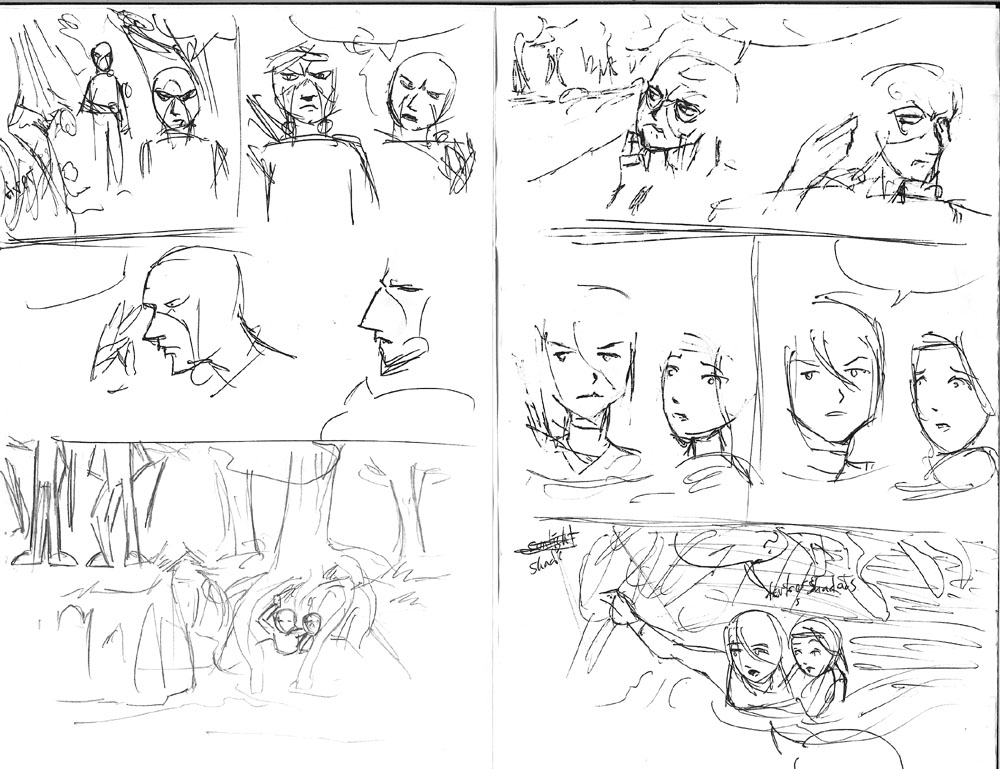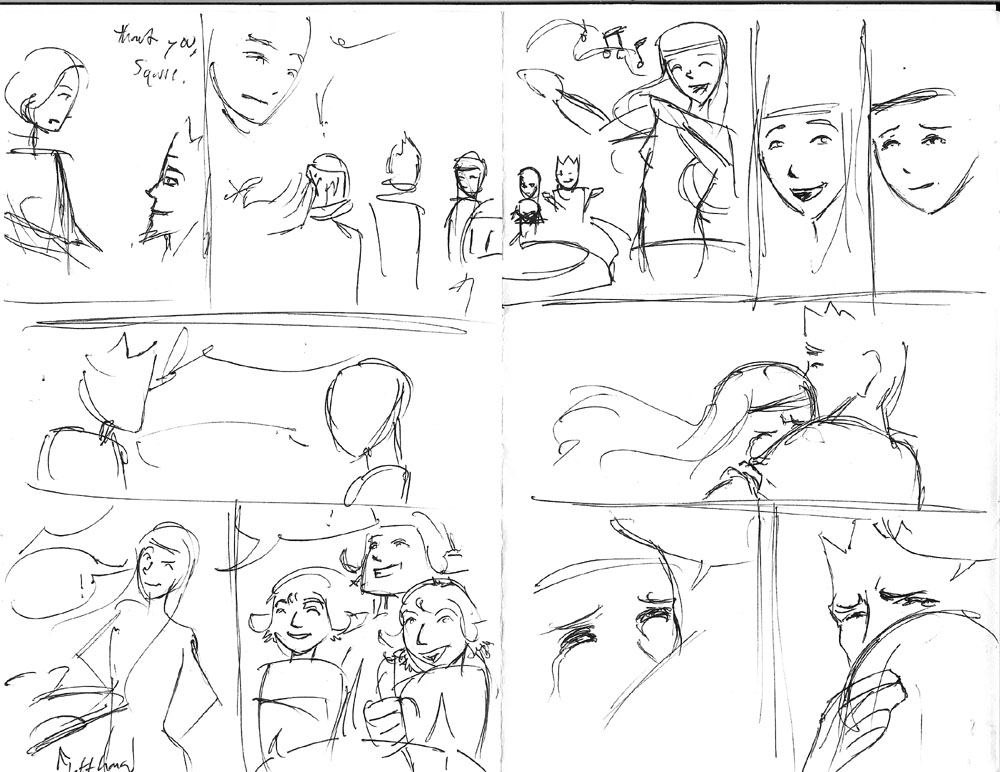 Page 46 And here is the start and end of the chase scene, so exciting chase stuff will be between these two pages (sorry, I totally lost my first draft of those pages). At the start we'll establish princess is facing back and holding to squire for dear life, and that 3 badguys follow. panel 2 there is actually 2 panels, one of squire looking forward, and the other of princess looking back over squire's shoulder.