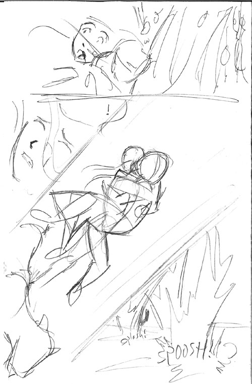 Page 44 Moving forward, these pick up from the end of the fight scene. Squire is reeling a bit from the hit she took, but quickly hops back into action, running on no end of adrenaline at this point. Since it's REALLY unclear, in panel 2 bandit riders are hopping over the tower debris and getting ready to attack.