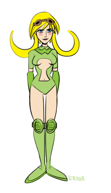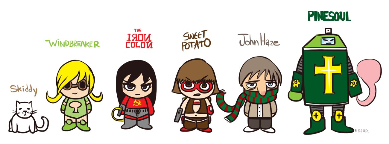 Sweet Potato was pre-superpowers Windbreaker's best friend. She felt slighted and neglected from Windbreaker's sudden fame and, having no powers of her own, devised ways to fight and keep up with Windbreaker as revenge. She aims to show people you don't need powers to be powerful. (Uses tanks filled with noxious gas for attacking and short-range flight. Has various gadgets, gas bombs, vials of malodorous and explosive chemicals, matches and lighters, etc.)