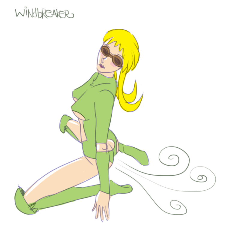 Windbreaker was once a normal girl, but upon eating a strange, superpowerful batch of chili at a local cook-off, she transformed into a gaseous avenger! Using her powers for smokescreen, explosive attacks, super-speed and flight, evil-doers better hope she doesn't have to fart superbad.