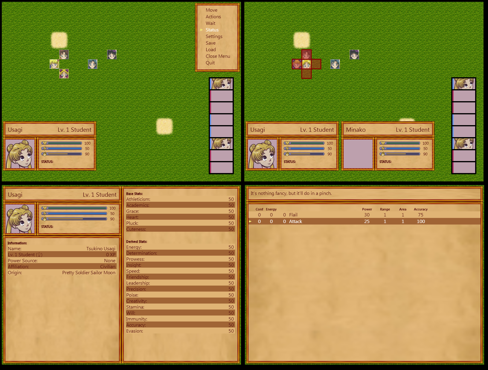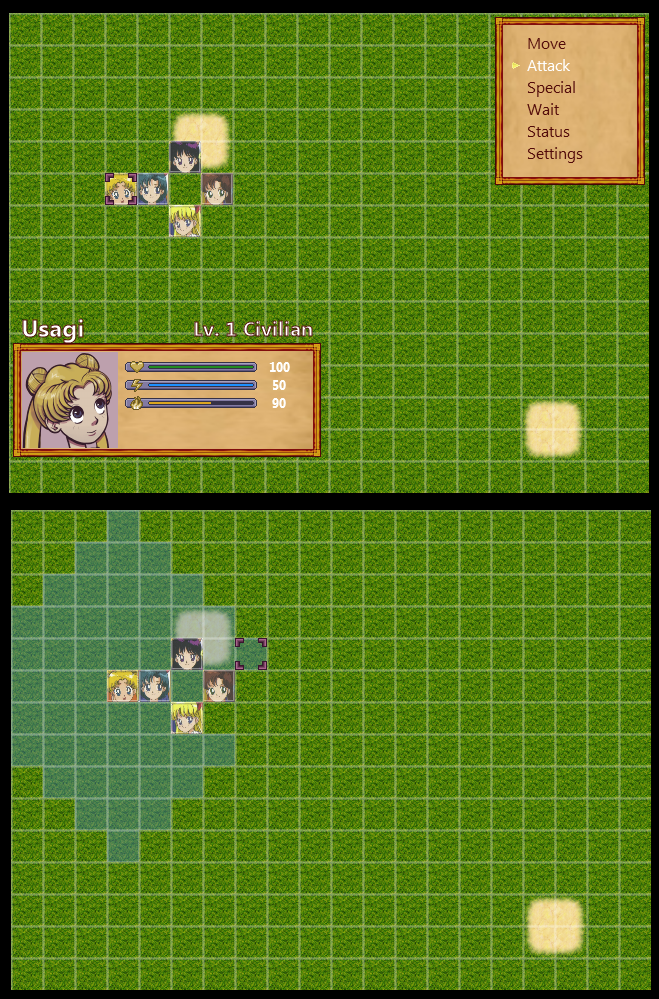 Not bothering with attack animations yet--that can wait until I've got a better idea of what all I'll need. I intend to do attacks as cut-ins, Super Robot Wars or Fire Emblem style, rather than map-animations. I do have some sprite templates in the work for those, but they take a lot of time and are low priority at the moment.