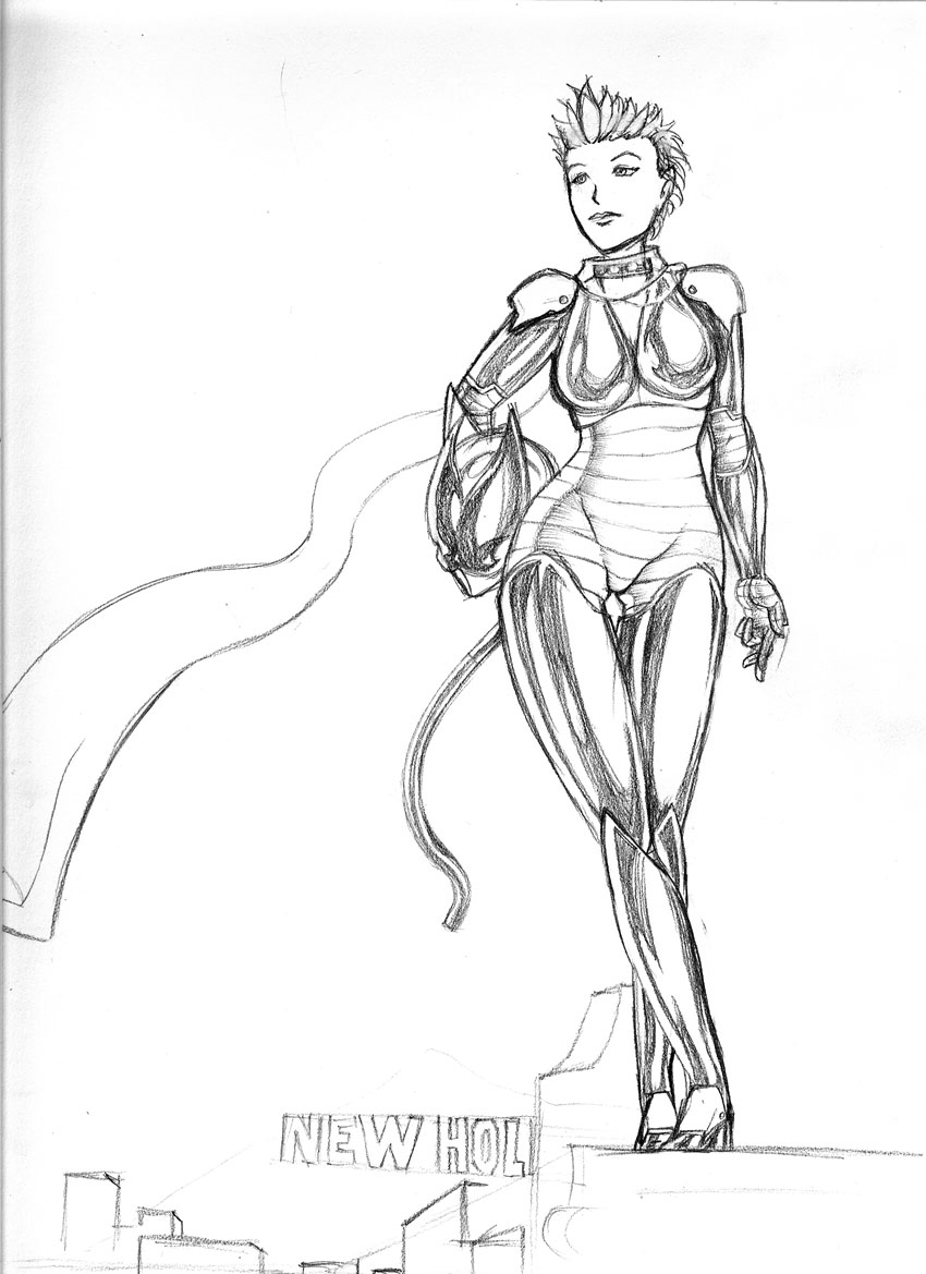 >>49564 I did decide to go closer to the shape of the original Black Cat's mask, as seen in this near final attempt at the suit. I decided the 'dips' in the seams to her underarmor just made the design needlessly busy, so I just went with straight seams. I realize above the "NEW" doesn't match the font of the actual Hollywood sign, but once I drew it I said "that makes sense" with how New Hollywood would be founded after earthquakes decimated the original. The entire era will be a mishmash of old and new, technological advancement and nostalgic all at once. At least, that's how it'll come across if I don't completely screw the pooch.