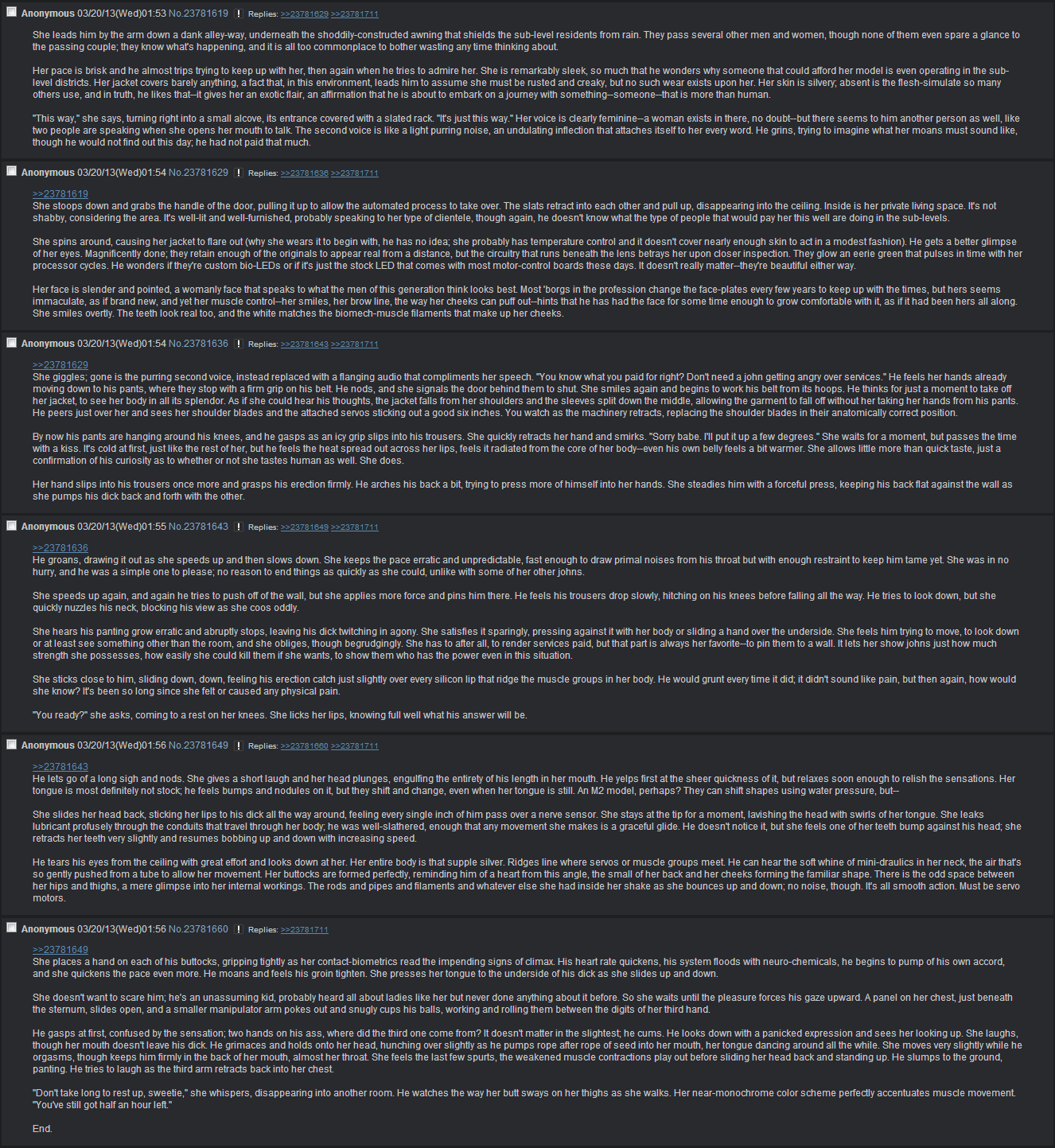 She will hold Cortana down for a while, as she tends to do, and as Cortana likes, while GLaDOS steps up her pace; Cortana will gasp and moan and bite EDI's thigh in a desperate attempt to stay silent, fail miserably, whimper GLaDOS's name, plead with her to go faster, deeper, harder. She will lavish praise on her tormentor, thank her for the teasing, the torture, the fucking she's receiving, because she knows that GLaDOS loves to be thanked for this, loves to make Cortana degrade herself. And, if she pleased EDI enough, and if she says everything GLaDOS tells her to, she will get to cum with her face buried between EDI's legs.