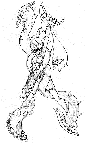 The ultimate attack-from-disadvantage character. Because of her kinship with her parasite, Eliza can control her own blood. Each time she is hit she bleeds, MK style, and the blood stays on the stage. Certain specials and supers can then use it.