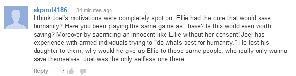 Then, looking at it from Joel's perspective, why would he care if humanity found a cure? His entire life is a testament to the ugliness of human behavior. People cheat, exploit, suppress, murder, rape, and even eat each other when things get bad. People who dedicate their lives to helping people ultimately lose to fear and panic, and people die because of it. In a sick and sad way, things just make more sense these days for Joel. Decisions involving other people are easy now. Losing Ellie in exchange for going back doesn't balance out from Joel's perspective. There's nothing better about a larger world to him, and the most important thing he sees is giving the chance for a life in THIS world to someone he cares about.