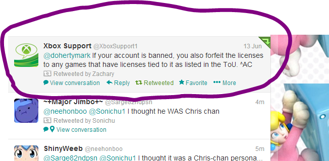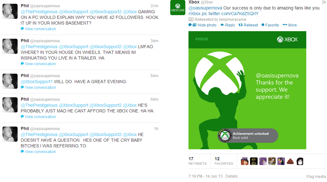 *Sharing games would have worked either by activating your Live account on someone else's Xbox One, or by including them in your 10-person share plan, which would not have been limited to "family." (This is a ploy to sell more Xbox Live gold accounts. And more importantly, you can already do this on the PS3. For free. Not the PS4. The fucking PS3. It violates the TOS, and you have to share your account information, but you can do it. And there's legitimately NO reason why Microsoft STILL couldn't do this. They are taking this away from you out of spite, and to me, that's fucking hilarious, especially considering the kneejerk reaction.)