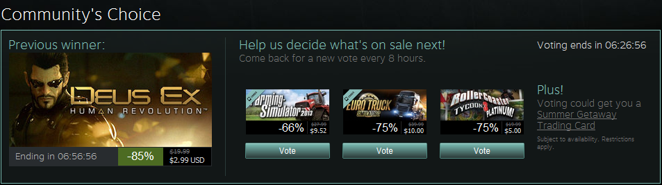 Phew, looks like I can have a day to let my wallet cool off. Nothing I'm either insanely interested in or at a price I would splurge at with daily deals. Same for the flash sales for now (I kind of want Mirror's Edge, but eh) and Community Choice, both now and whatever wins next. Flash Sales are the only possibility, tonight.