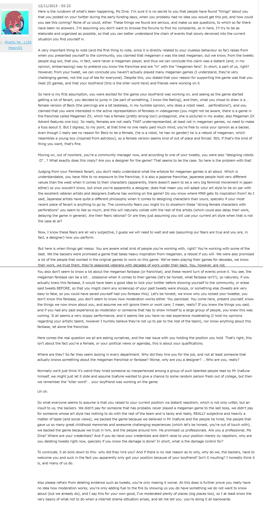 >Her lack of experience with Megaman is concerning. Considering she’s both a designer AND is in charge of interaction with a fanbase she’s not in touch with (due to lack of experience in MM), this is a problem.