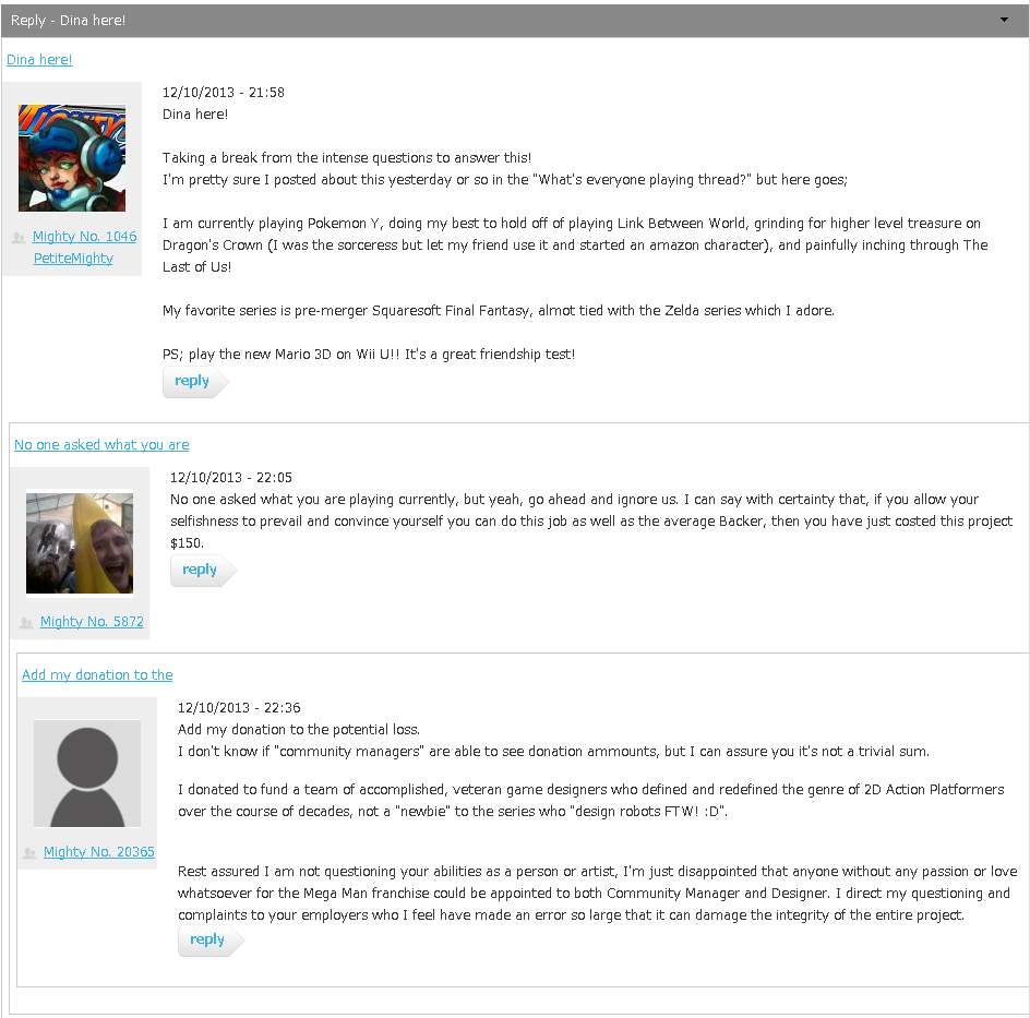 >People (especially backers) are concerned with letting an amateur design their game. [...] The backers were promised work by professionals. Seasoned designers of the Megaman franchise.