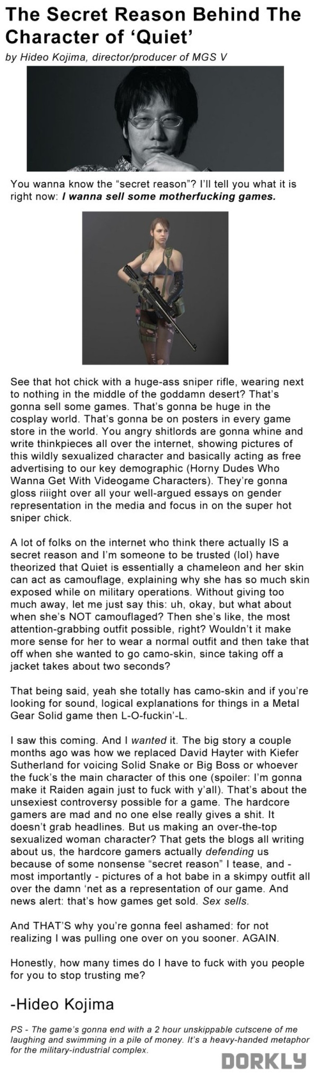 That's what our society is like. That's what our ideas of "normality" and gender relations and race relations and heteronormativity are like. They are built out of a million tiny things. So maybe ONE video game featuring Syldanian Six-Boobed Slut Warriors or whatever will not have much effect on society. The thing is, there isn't just one video game like that, and that isn't the only place the idea that women are objectified. When people criticize Hillary Clinton's appearance (because male politicians are such hotties, right? Not bloated, liver-spotted, fat old men) . . . that is a little piece of tile. When a comic artist draws kidnapped male Justice League characters in tied up but non-sexy poses, while the kidnapped female Justice League characters are tied up like they're getting geared up for a video session of "Bondage Sluts III" . . . that is a little piece of tile. When someone tells a sexist joke . . . that's a little piece of tile. Look in the comments section of any online news story about a woman being raped and you will find more little bits of tile.