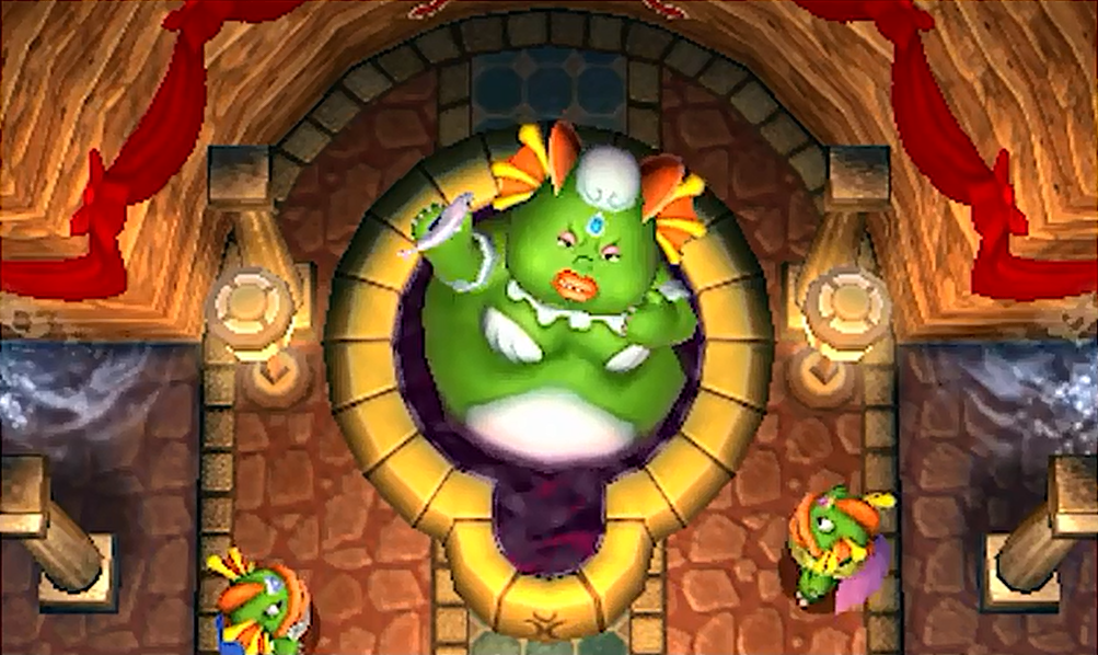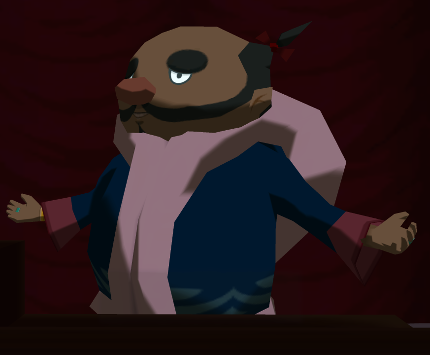 Take this guy for example. Round face, vomiting water all over the triforce. Only way to get it to stop is to play Zelda's song. This fellow, whom is never given a name, appears in the Shadow Temple, opposite the statue and column perch of a large bird-figure. It's almost like in order to get to the next room, you need to turn the face of the bird statue (a patron deity?) away, and then leap across the gaping shadowy chasm onto the tongue of the menacing figure, sticking out of the wall face and providing a door. A figure like that also appears in the wall art of Wind Waker and as a long tongued bust in Link to the Past, where you pull it's tongue to open doors.