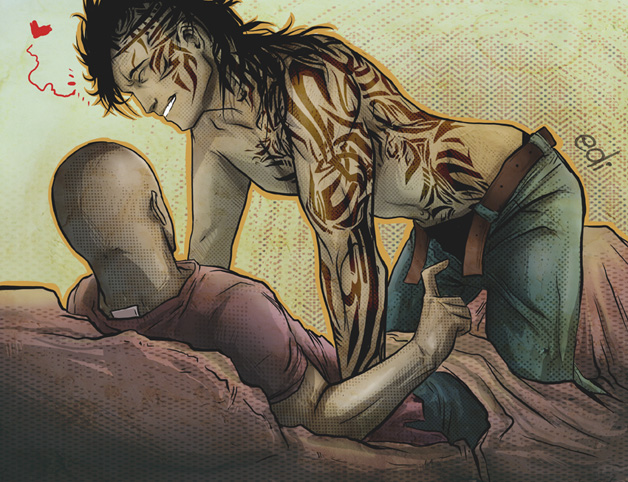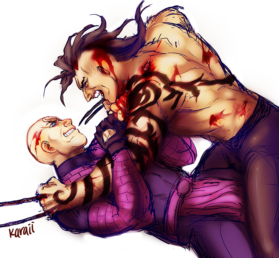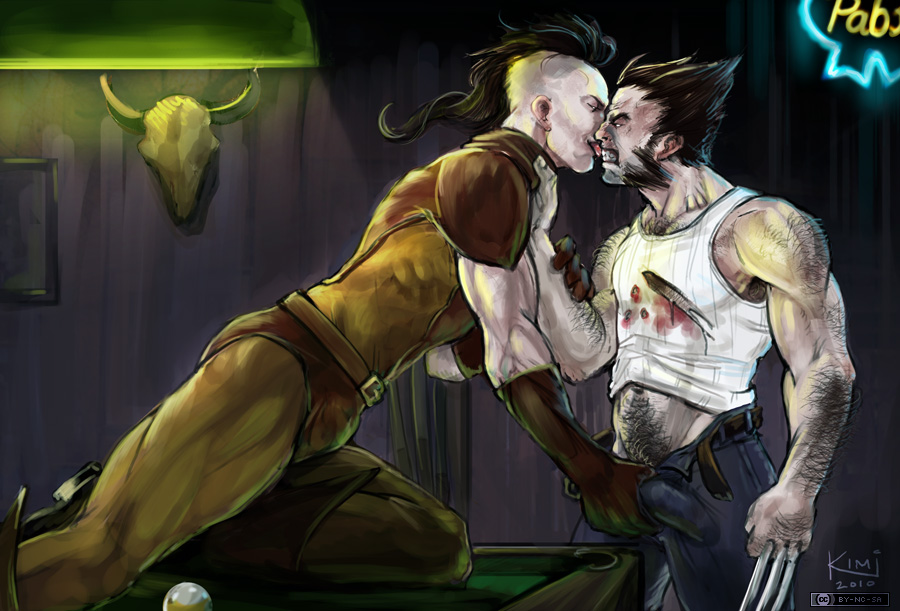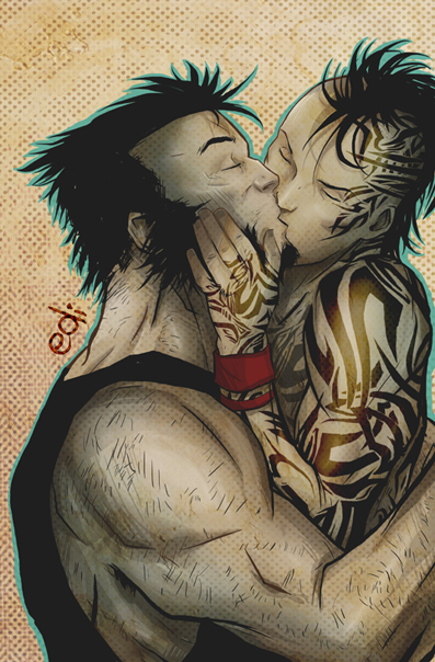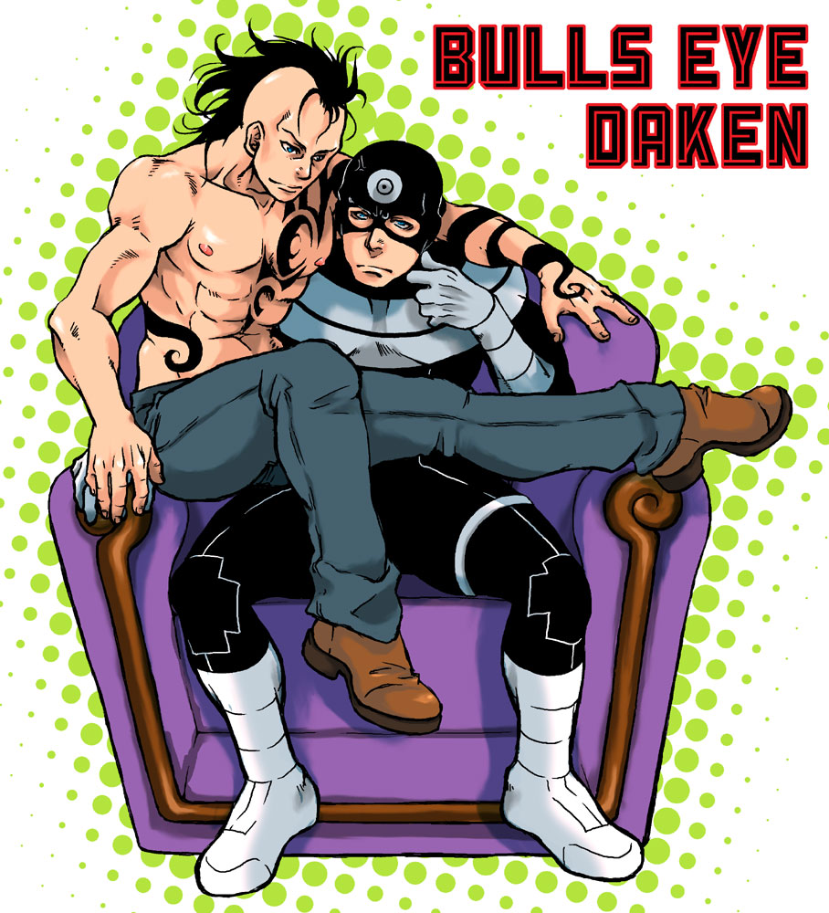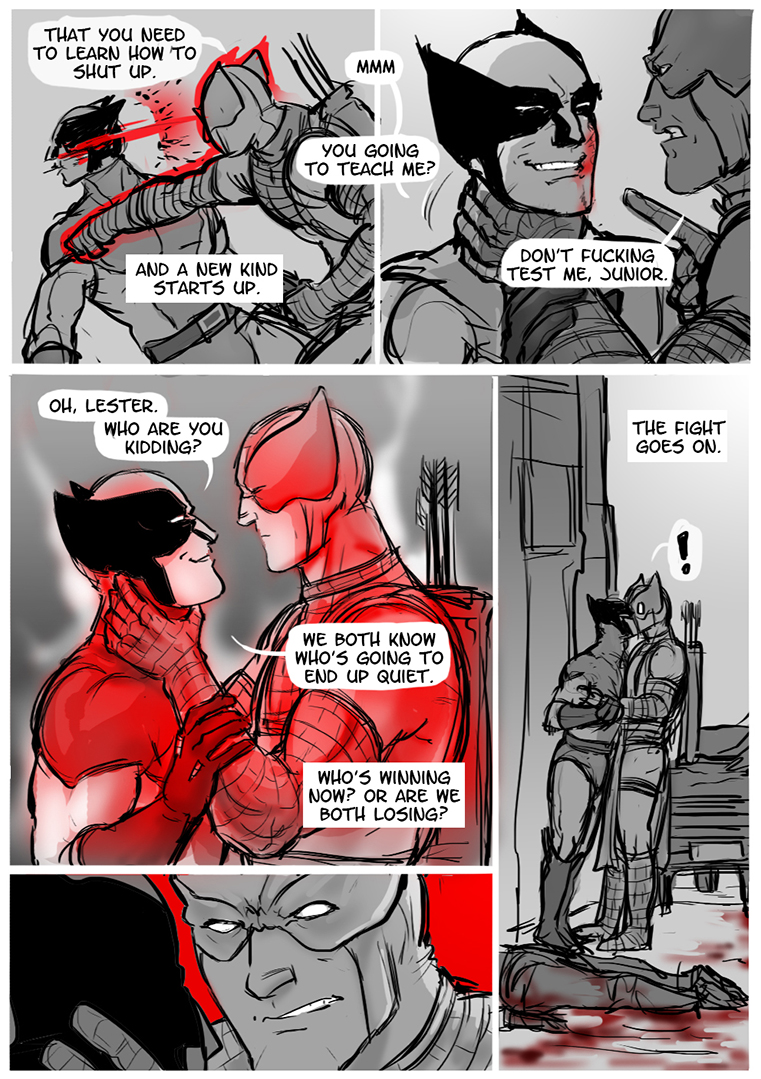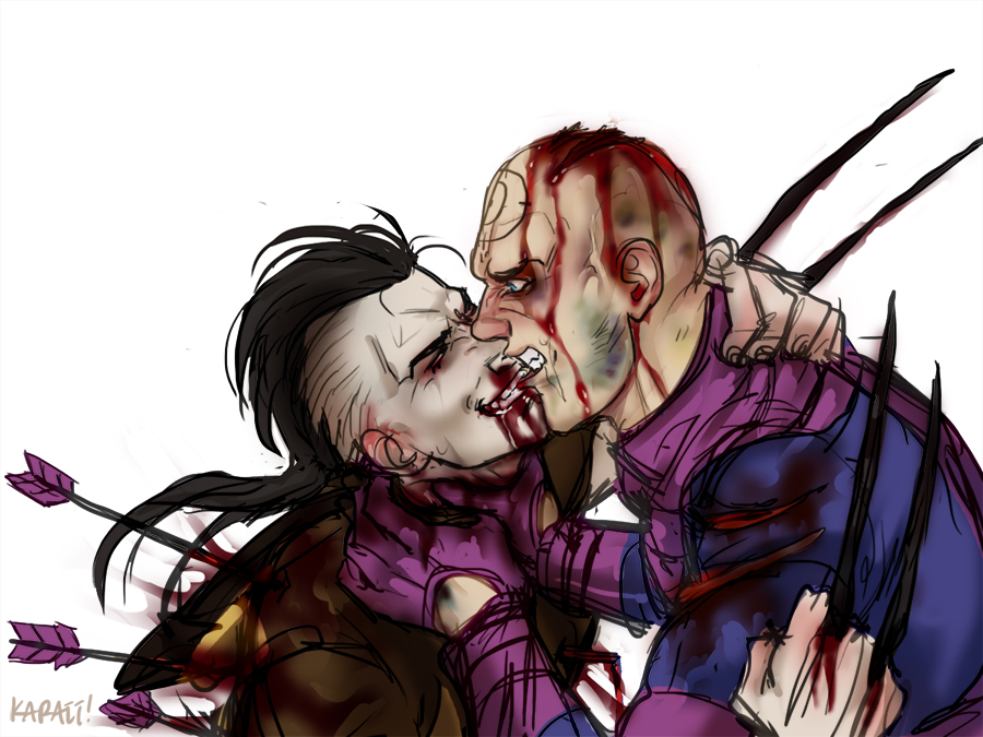Daken started his day by answering his door and being pummeled to the ground by a seemingly irate Bullseye. Now whereas being assaulted by Bullseye wasn’t unexpected or all that unusual, the manner in which it was occurring was however very unusual. A forceful kiss surprised Daken enough to open his mouth and allow for Bullseye to force his tongue in. It wasn’t at all how he had expected to start his day, not that he was complaining, merely that he was somewhat bemused by the whole affair.