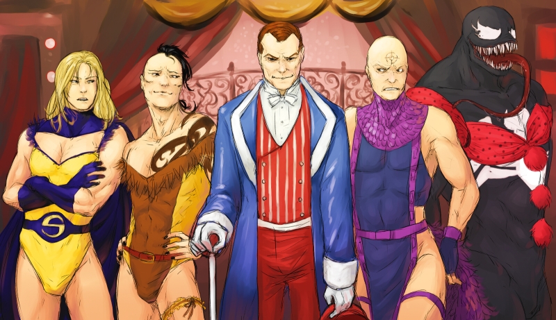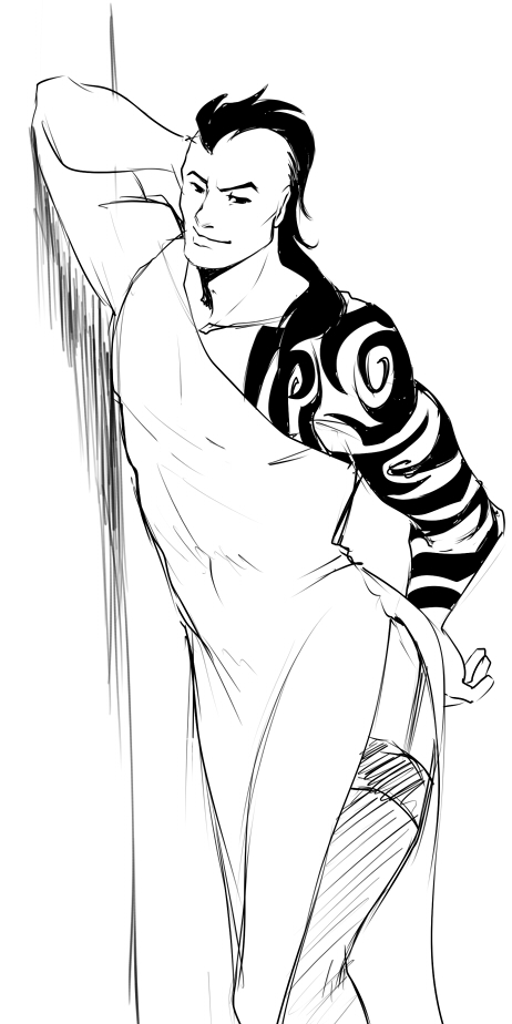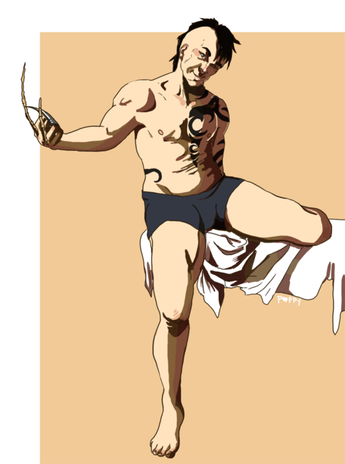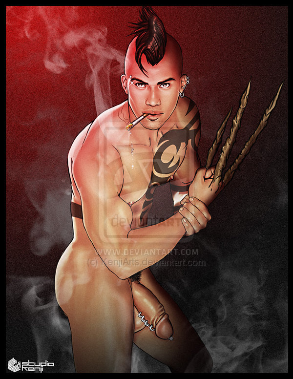 Daken started to tear his costume off, unsatisfied by mere frottage. Carefully using his claws, he cut off the offending tights and underlying underwear but left the loincloth in place - enjoying seeing it fulfill its function in the most inadequate manner possible. Bullseye’s erection was plainly visible beneath it and Daken had easy access to everything interesting. And Lester did make a delicious display.