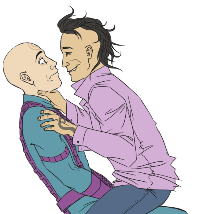 “Good morning to you too, Lester,” Daken gasped, still restraining the other man who was glowering at him, and dare he think it, pouting at the lack of contact and transference of bodily fluids. “Have you possibly taken Mac’s medication today and not your own?” He queried and grabbed Bullseye by the face to stop him from trying to kiss and, kid you not, lick him again.