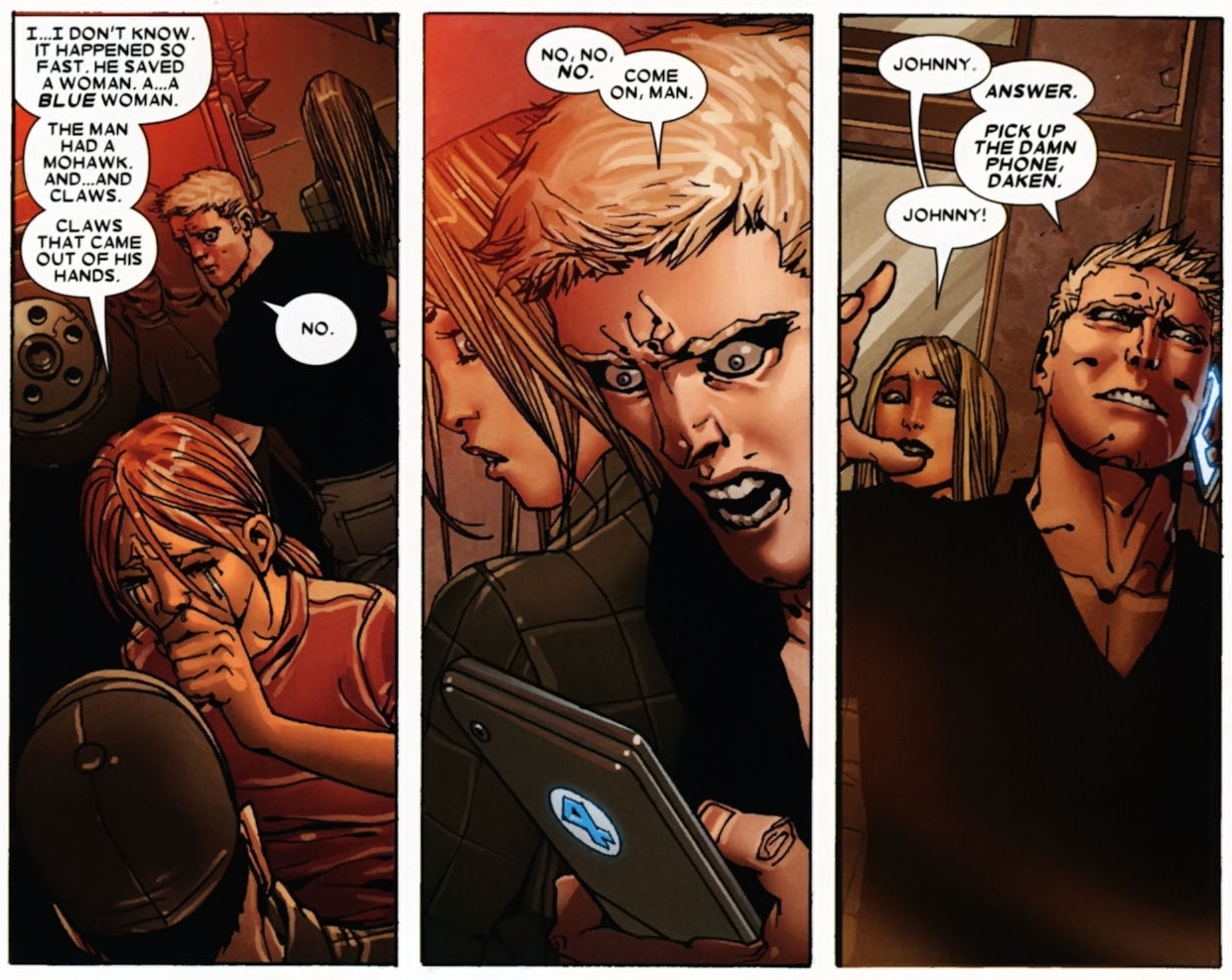 “Hey, Daken, have you seen-- eek my eyes, my eyes!” Mac cried out and cowered in the open doorway. Daken stopped his pleasurable activities with a huff, glaring at Mac who was hiding his face in his hands.
