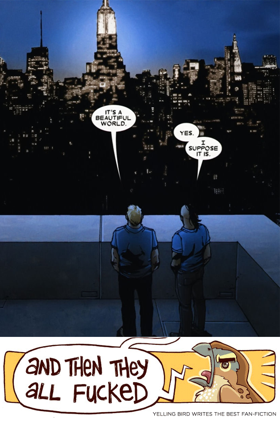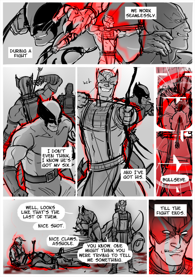 Nevertheless, Daken did like his partner’s incoherence to be caused by him - or at the very least for its cause to be known to him. He did not enjoy not knowing. Once more taking a hold of Bullseye’s jaw to keep him from biting or kissing him and to still in his lap, Daken scrutinized him with all of his senses. Regardless of his careful inspection and the acuity of his senses, Daken could not discern anything but a heightened arousal in his otherwise very taciturn and self-denying team mate. Everything except for his behavior seemed normal right down to his Hawkeye costume - sans the mask - and breakfast choices.