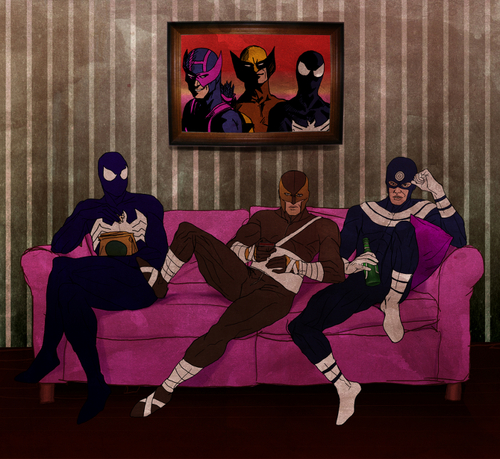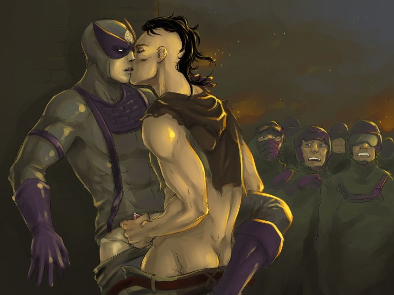 “You are really testing my patience,” Daken chided halfheartedly, “are you that keen on getting fucked?” He let his free hand slip down to Bullseye’s firm ass - beneath that ridiculous loincloth - squeezing at it. Lester made a happy little moan and rubbed down on him; Daken could feel his erection press at him through the Hawkeye costume.