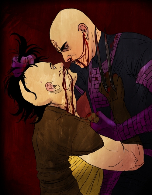Daken clucked his tongue in disapproval, eliciting yet another whine from Bullseye’s swollen, pink lips. It was quite obvious that Lester had some awareness of his surroundings and comprehension of the state of things, but there didn’t seem to be much conscious thought occurring in combination with it. Nominally, Daken would have taken full advantage of this but it did reduce some of Lester’s charm.