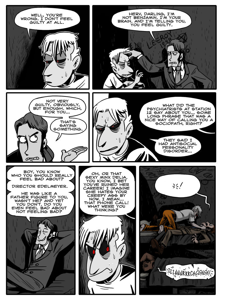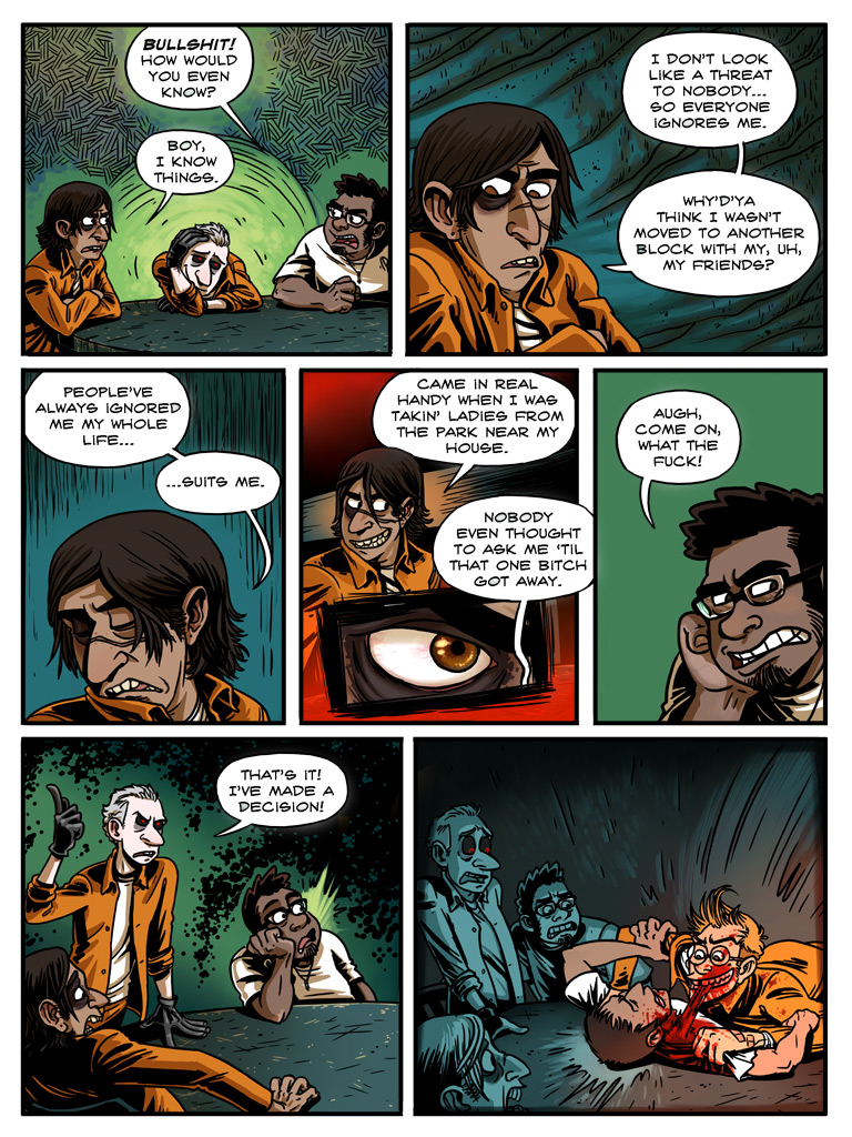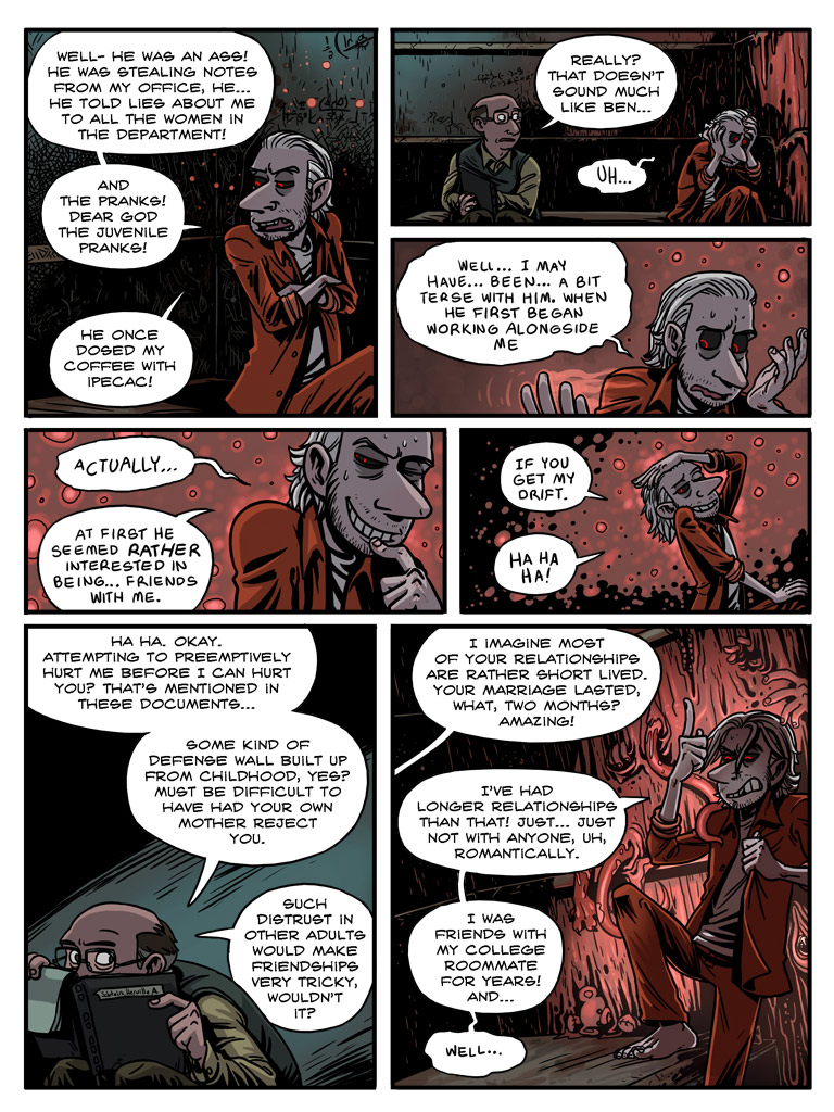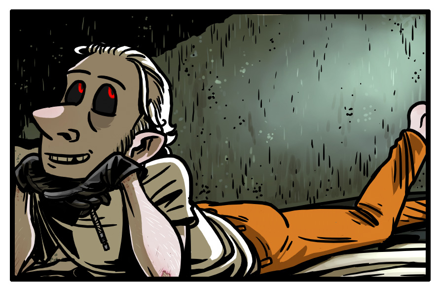 Laughter, chiding, they start to leave, and as his mind, that sick vicious animal, becomes aware again, it rears back and becomes enraged. /Laughter./ /At him/. In this prison he has no weapon but his words. Furious in his shock, he hisses “/Slimy trailer park afterbirth/.” It’s his gut instinct, and as with many of his instincts, it results in a monumentally terrible decision.