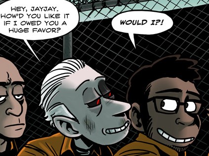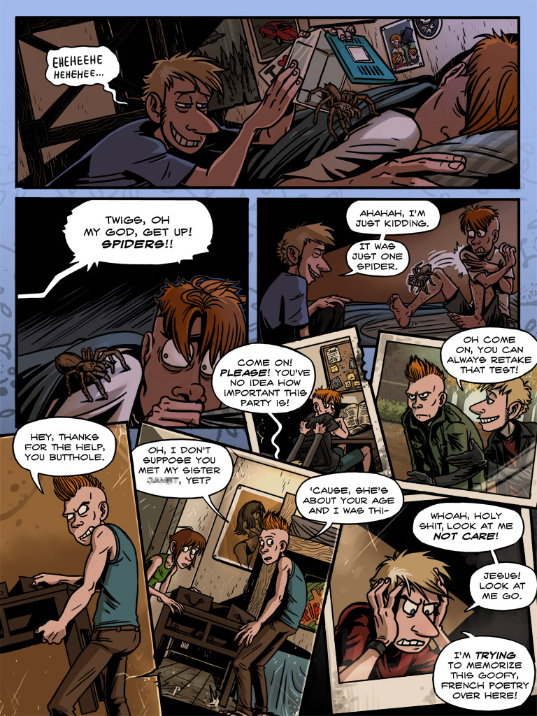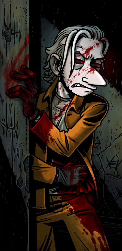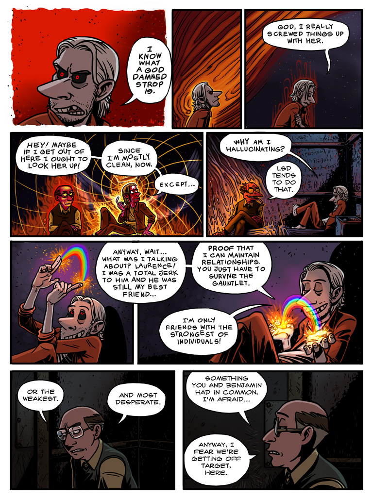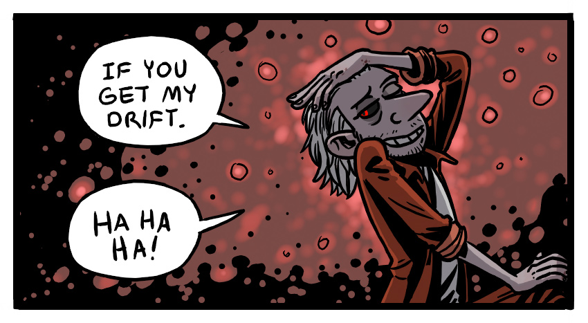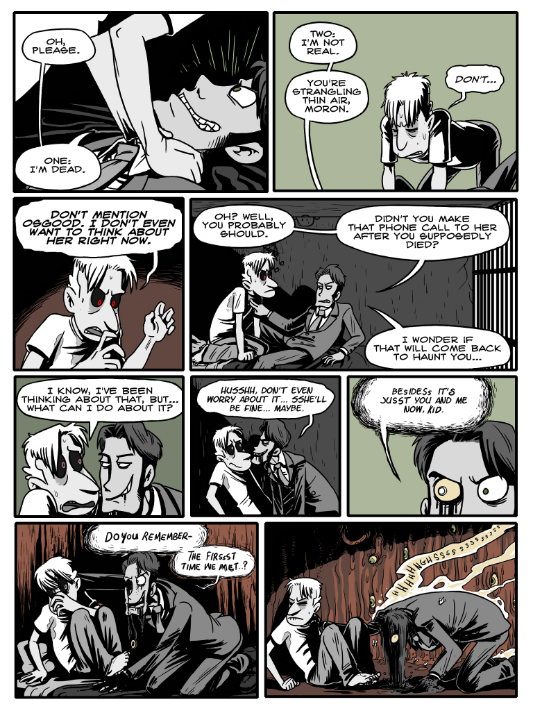 Laughter, chiding, they start to leave, and as his mind, that sick vicious animal, becomes aware again, it rears back and becomes enraged. /Laughter./ /At him/. In this prison he has no weapon but his words. Furious in his shock, he hisses “/Slimy trailer park afterbirth/.” It’s his gut instinct, and as with many of his instincts, it results in a monumentally terrible decision.