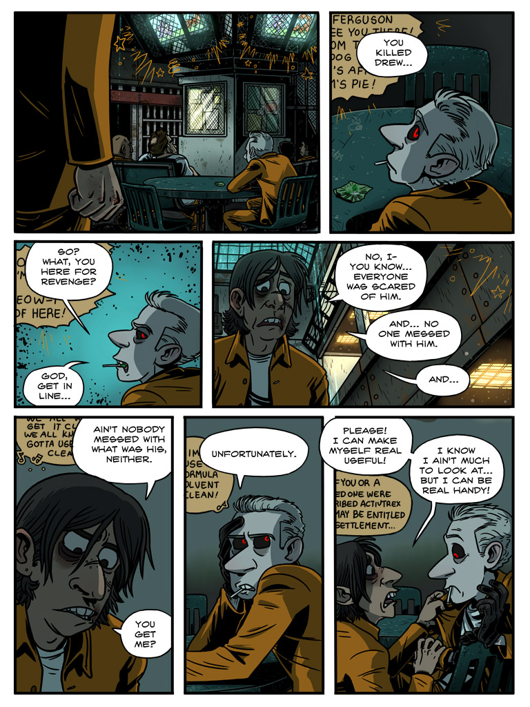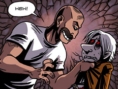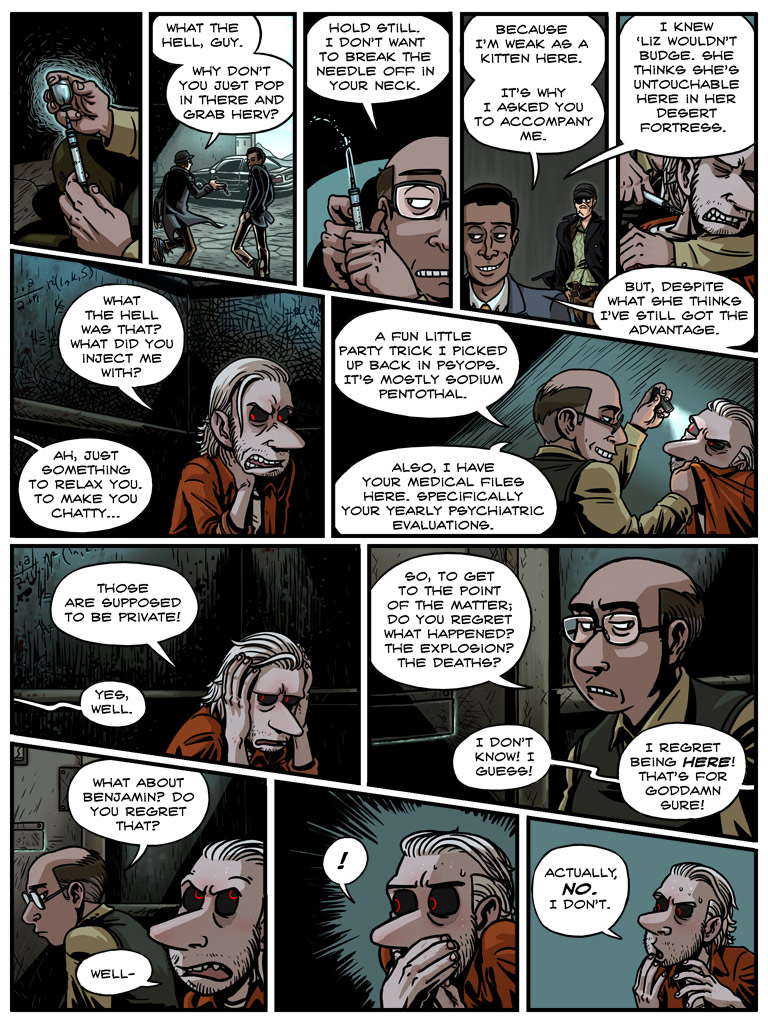 MacManus looms over him, a mocking smile playing about his face. “Couldn’t help yourself, huh, Doc? I almost feel sorry for you.” He sighs. “You’re a bit like my dad’s old dog—you just don’t know when to stop barking.” MacManus smirks. “Well, we fixed him real good. I’m sure we can do the same for you. Whaddya say, boys?”