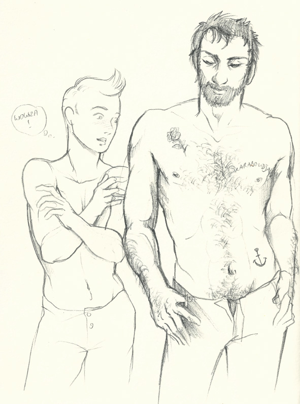 Tintin opened his bedroom door to find Haddock stalking down the hall, only dressed in pants...and looking about twenty years younger; no beard, no wrinkles and only the slightest tinge of red on his nose from drinking. No tattoos yet, though his chest was really well defined...
