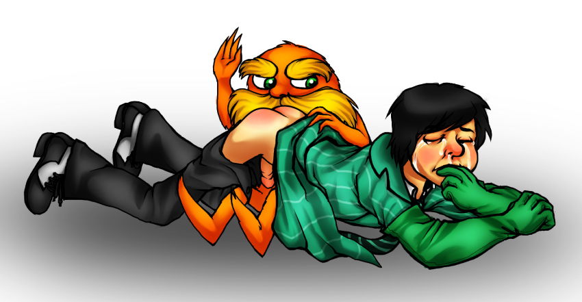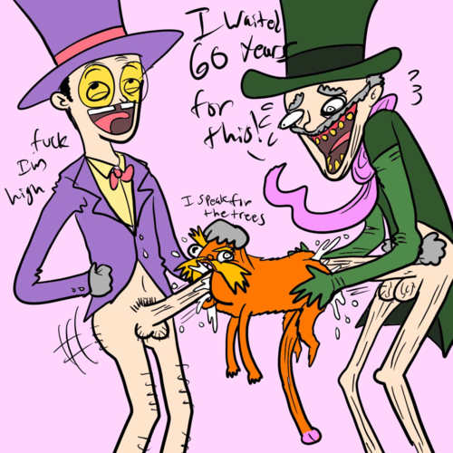 The Greed-ler sat in pain on his golden toilet. He’d been like this for a while now, his aching colon desperate to be relieved of its fiery and stuffed state. His brow dampened as he tried to force his long overdue crap out. “AAAARGH!” He groaned painfully. “ Fucking shit! I ran out of laxatives!” He threw the white empty box on to the floor. He rocked his baby soft ass up and down on the toilet. His hair was sticking to his sweaty red face. Greed-ler sighed and ran his fingers through his black hair. “Goddamn.” He mumbled under his breath. He clutched his hand around the toilet paper spool and let out a blood curdling scream as he tried to push the poop out. His yell echoed throughout the corridors. In the distance one could hear the swami swans wings flap as they fled the scene. The Loraxs’ hair stood straight up at sound, his green eyes flew wide open. “What the!?” He bellowed. He curled his lips and snarled. “That damn beanpole….” The Lorxas strutted off to Greed-lers factory, mumbling various insults and complaints, one of them claimed the Once-ler to be a ‘nipple-boy’. He arrived at the window of his office, with his beady eyes he glanced around the room, the Once-ler nowhere to be found. Suddenly a pained moan dug its way into the Loraxs’ furry ears. “Found ya’ beanpole.” He followed the sound of his voice, leading him to the men’s restroom. Little did the Lorax know what the door in front of him held, being a forest animal he simply took his pees and poops anywhere he felt like. The blue male figure struck confusion in his tiny brain. The Lorax propelled himself up towards the door knob, finally grabbing hold and opening it on the third try. “Alright beanpole, explain tha-…..” He stopped mid-sentence as a terrified expression spread over his face. “Uh, wow.” He scratched the back of his head. “I guess I’ll be leaving now…” “ Wait, no!” Greed-ler shouted, he gave a shameful sigh and began to explain himself. “I need serious help.” The Lorax closed his eyes. “What is it money bags?” The Once-ler gulped. “I can’t crap bro, I just can’t.” The Lorax pursed his lips and rested his palm against his forehead. “Let me take a guess kid, you got your pipes all backed up huh?” Greed-ler whimpered. “Uh huh.” Another sigh escaped the Loraxs mouth. “Alright, I’ll help you out kid.” The Lorax dug into his pockets and pulled out a royal blue package labled ‘Escamilla Relief.’ “Here you go kid, the finest laxatives in all of the Truffula forest.” He handed him the medication. Greed-ler gave a confused look as he snatched the package from his furry hands. “Escamilla Relief?” He questioned, this wasn’t his brand, if this was the finest quality he’d hate to see the worst. “What kind of laxative are these? Poor people laxatives?” He mocked. “No, now do you want to fix your little problem or go out and get your own rich kid laxatives?” Mr. Lorax asked, a bit hurt at how he mocked his laxative that he spent five months to save up for. “No no no no! I am sorry!” Pleaded the Once-ler. “That’s what I thought.” Smirked the Lorax. The human rolled his eyes and took the pills. Thirty minutes passed and the Once-ler took the very first drops of his long awaited shit. The Lorax hopped down from his place against the bathroom window. “Hold up, you gotta repay me for those laxatives, naughty boy.” Once-ler waved his hand dismissing him. “Yeah, yeah. I’ll give you some cash later.” The Lorax hopped on to the others skinny legs. “I don’t want cash, I want something else from you.” He smirked. “We’re gonna have some fun with your shit, Oncie.” The billionaire gulped. “Uh, that’s a joke right?” The Lorax frowned before shoving his furry fist into Once-lers anus, preventing him from shitting any further. The Once-ler realized the seriousness of this situation, he bit down on his lip before yelling out in agony. “Alright! We can do it! Just please remove your hand!” He smirked, feeling empowered by the control he had over the other. “Good boy, now get up for daddy.” He sung. Greed-ler did as he said, the Loraxs furry hand still in his tight anus. So, so, so, fucked up, thought Greed-ler. “We play by my rules now, babe” The Guardian of the Forest gave a devilish grin, staring straight into Greed-lers eyes. His stretched anus clenched around the forest animals fist, he gave a faint moan as his furry knuckles tickled his prostate. “Just let me shit bro.” The room fell silent as the Lorax thought for a moment before swiftly removing his fist. Greed-lers liquid-like defecate started flowing heavily out of his puckered entrance. The Loraxs hand was covered in the brown stinky waste. He sauntered over to Greed-lers, who was currently laying down on the bathroom floor, shit still flowing. The furry paw met his face. “Now lick it.” Commanded the Lorax. Greed-ler backed away, trailing his shit with him, his hands shielded his face. “Oh god no, please. No, no.” Greed-ler pleaded. “A deal is a deal, my good friend.” He scolded, swatting his hands away , forcing this shit covered hand into the others mouth. Greed-ler gagged and trued to escape but found himself victim to the Loraxs feces coated hand. The shit and salivia joined together in his mouth. His tongue pressed against the hand, gently lapping at the mixture. Eventually Greed-ler swallowed, the steamy acidic mixture was harsh on his throat. Mr. Lorax yanked his hand out of the others mouth in an attempt at showing good ol’ Oncie who’s boss. The latter gasped and took deep breaths, his eyes wide, obviously applaed at what he had just done. He was about to speak, but was cut off by his partners quick and nimble fingers, gently pressed against his lips. “Time to rid of these shall we?” He hummed. And just like that the Loraxs nimble fingers removed the jade green suit and just as quickly re