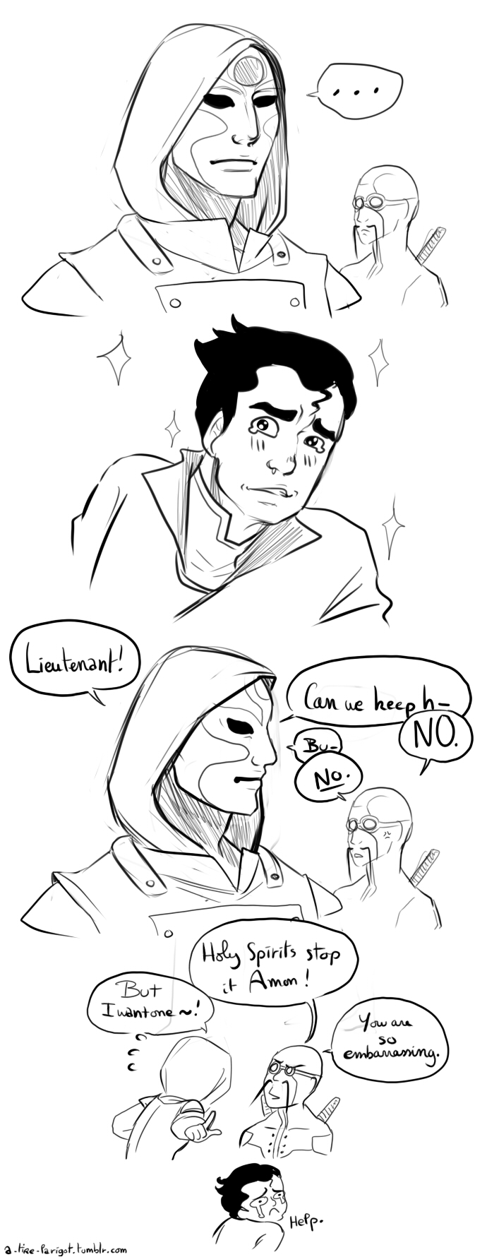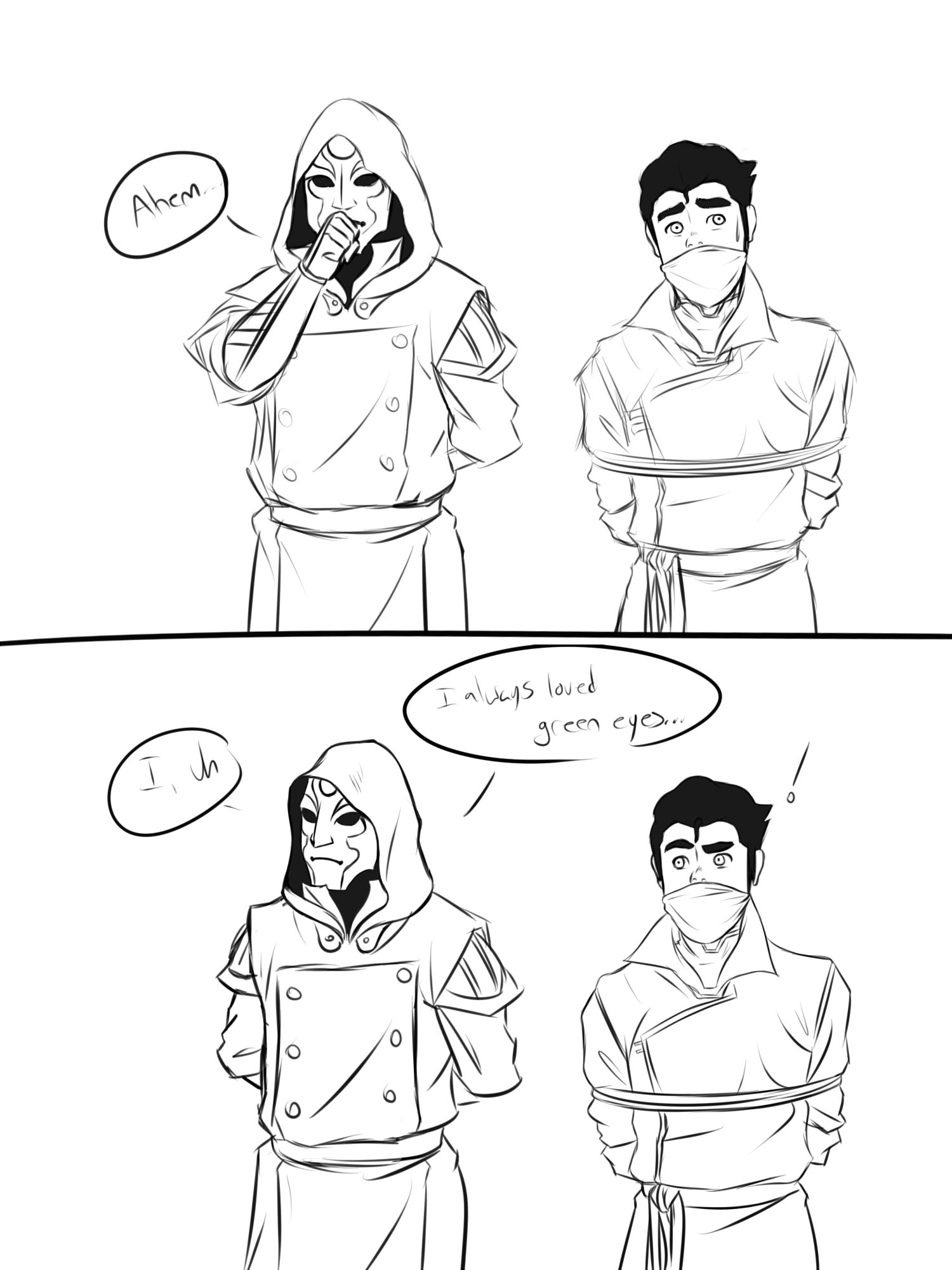 "And this one?" Amon had asked. His voice was deep and resonating, and carried a sense of pragmatic charisma with every syllable. Bolin felt a finger hook the back of his collar and tug down and back, exposing his neck. He might as well have been naked for how that small exposure had made him feel. The equalist that had been listing names coughed, admitting that he hadn't any reports on this fifth captive. Amon made a humming noise behind his mask.
