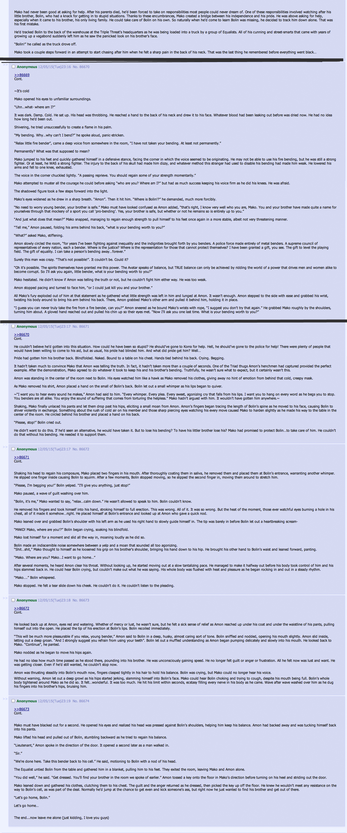 part 2/2 (I don't know how long the character limits are here, so I just kept the same split from the kinkmeme comments) ------- He remembers the hairs on the back of his neck prickling, as he didn't dare to turn around to see Amon and risk getting reprimanded for it. He remembers the anxiety making his heart beat in his chest as the anonymous chi-blocker listed the captives by name. Lightning Bolt Zolt, leader of the Triple Threat Triad. Spins, his firebending right hand. Shady Shin, the man whose proposition had gotten Bolin into this mess in the first place. Footprint Fuu, another smalltime bending thug like Shin-- and a pause.