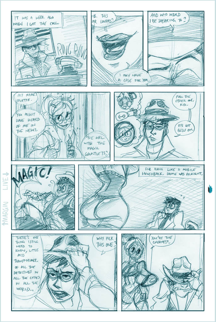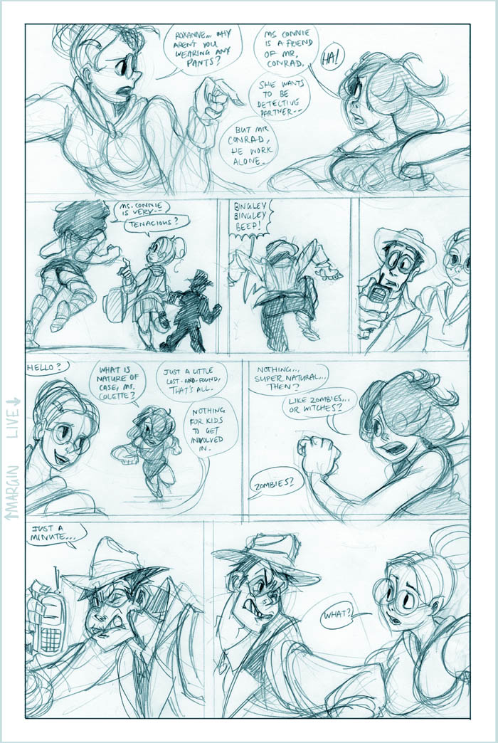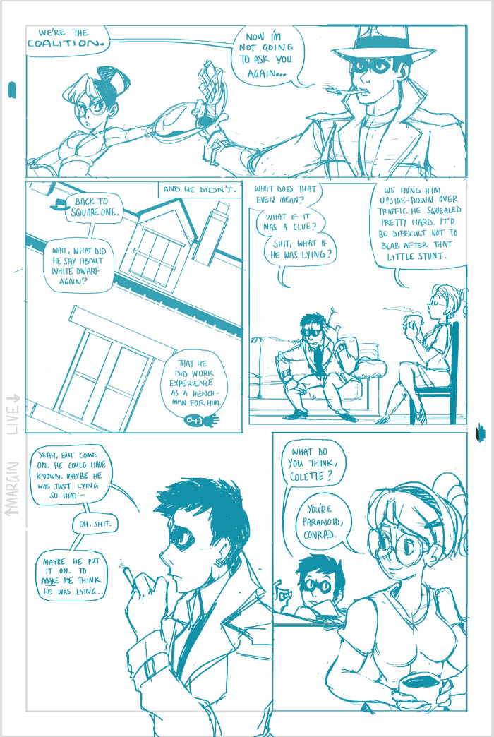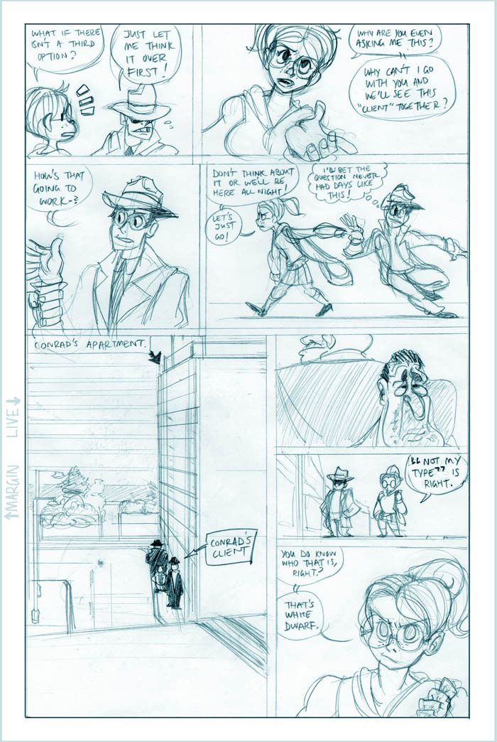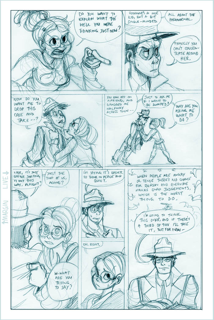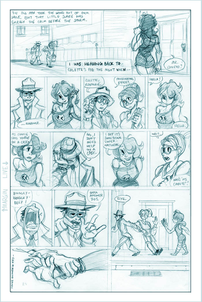 Ahh, we see it now - Roxanne's a little off the deep end. She's a sweet girl, though, and we'll see more of her eventually (I hear the Fatguy finds her creativity riveting!). Meanwhile Conrad, the man who just can't seem to concentrate, seems to be offering Colette a choice - either he can work on her case and presumably remain flat-broke for however long it takes, or he can take the rich job and leave Colette in the dust. He's not saying anything like "oh hey maybe we can do this now and this later", it's just X or Y. Colette's just thinking What The Hell, Conrad.