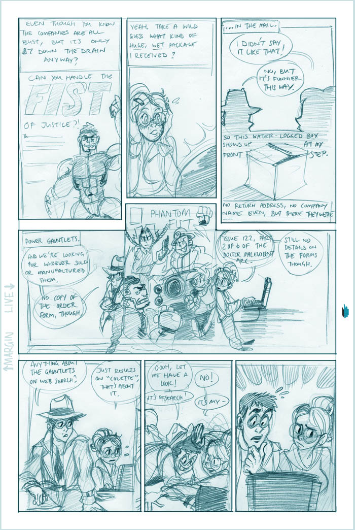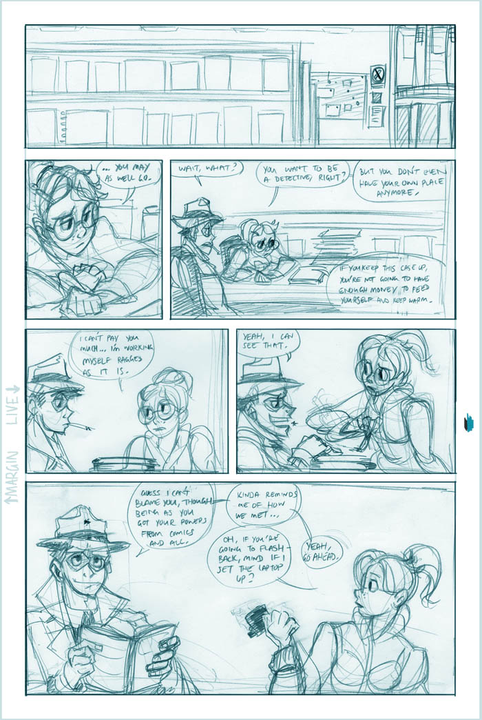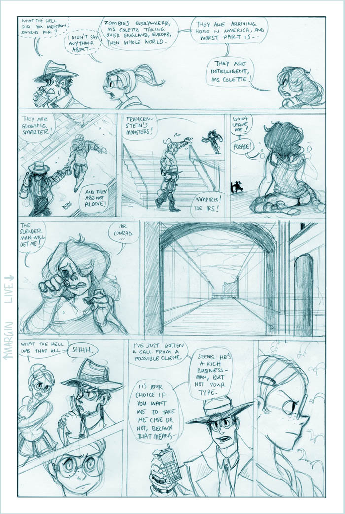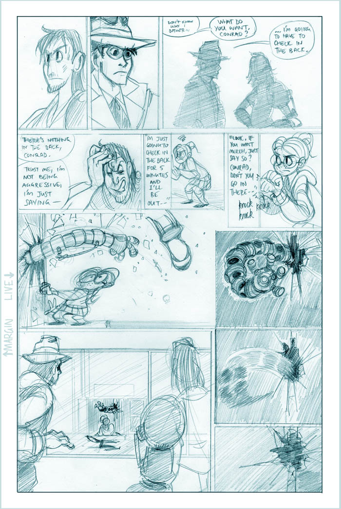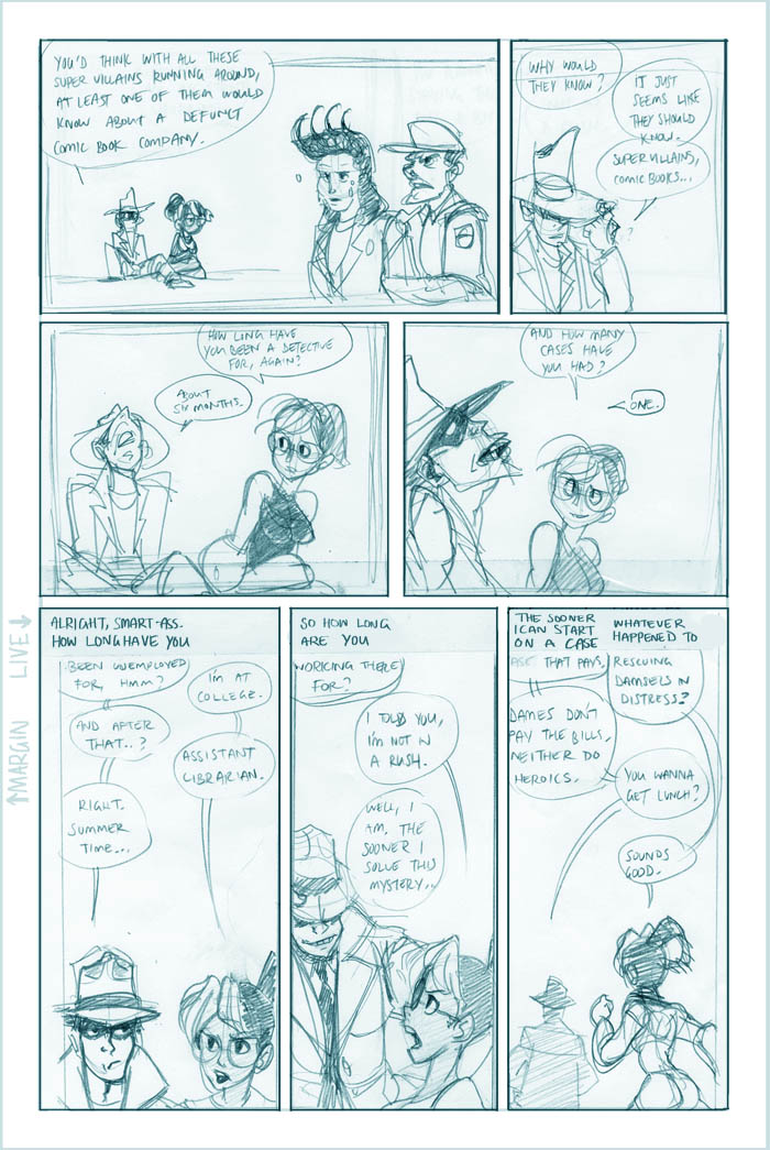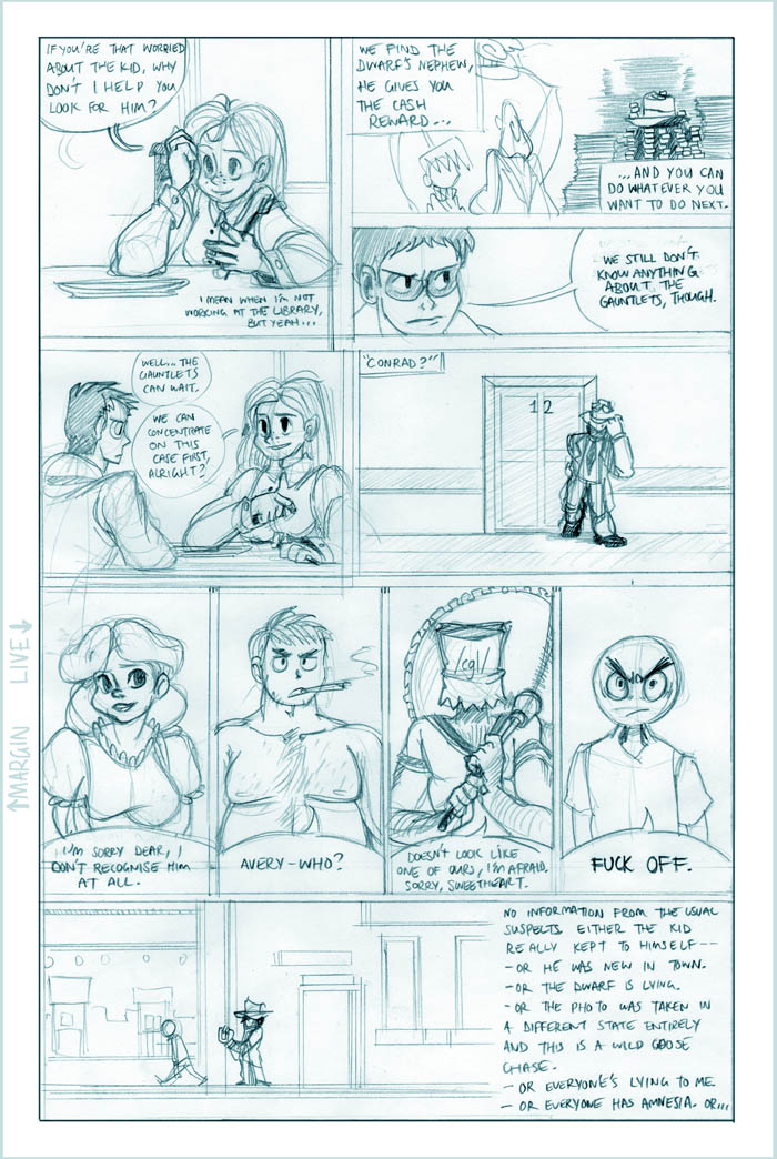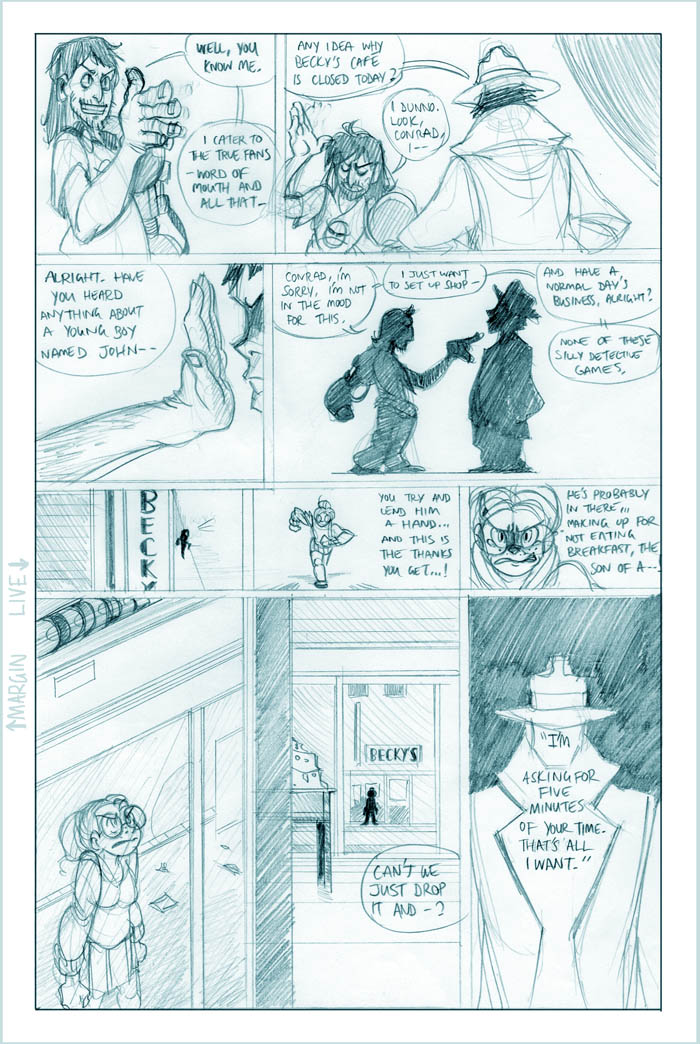 Ahh, we see it now - Roxanne's a little off the deep end. She's a sweet girl, though, and we'll see more of her eventually (I hear the Fatguy finds her creativity riveting!). Meanwhile Conrad, the man who just can't seem to concentrate, seems to be offering Colette a choice - either he can work on her case and presumably remain flat-broke for however long it takes, or he can take the rich job and leave Colette in the dust. He's not saying anything like "oh hey maybe we can do this now and this later", it's just X or Y. Colette's just thinking What The Hell, Conrad.
