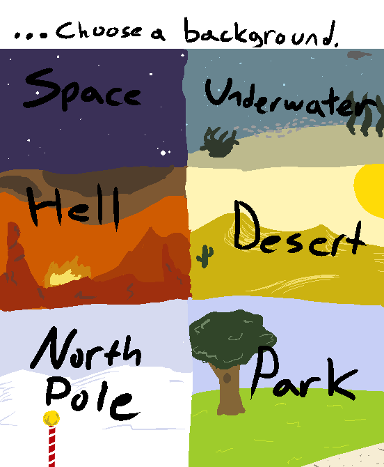 1-6 Backdrops: Space-1 Underwater-2 Hell-3 Desert-4 North Pole-5 Park-6