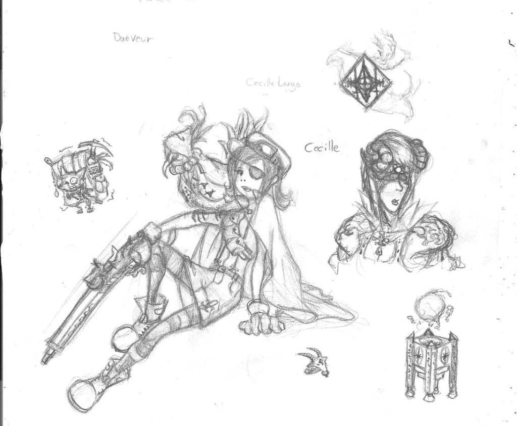 Story time: Cecille is a part of a powerful magic-using race called the Mnerisse, humans who've been given the witch's blessing by an elder Mnerisse and gain incredible powers that over time that will rival those of gods. Their form is basically human with the exception of ram-like horns that grow from the temples, this makes it difficult to fit in among the overall populace undetected. As the Mnerisse mature so do their horns which don't appear until typically 5 years after their blessing, in addition they start to lose their eyesight within the first year (hence the eyepatch), once blind they are able to truly gain ultimate sight, their sensory surpasses that of any human. The power of each Mnerisse varies, their talents are not attributed to any certain schools of magic like humans, each individual has their strengths and weakness and some can be as powerful as to be unkilled by any mortal. Mnerisse share a common ground in having the ablility to bestow magic power to another , they can even give animals the ability to reason thus making them their familiars, cats are a very common but excellent choice.
