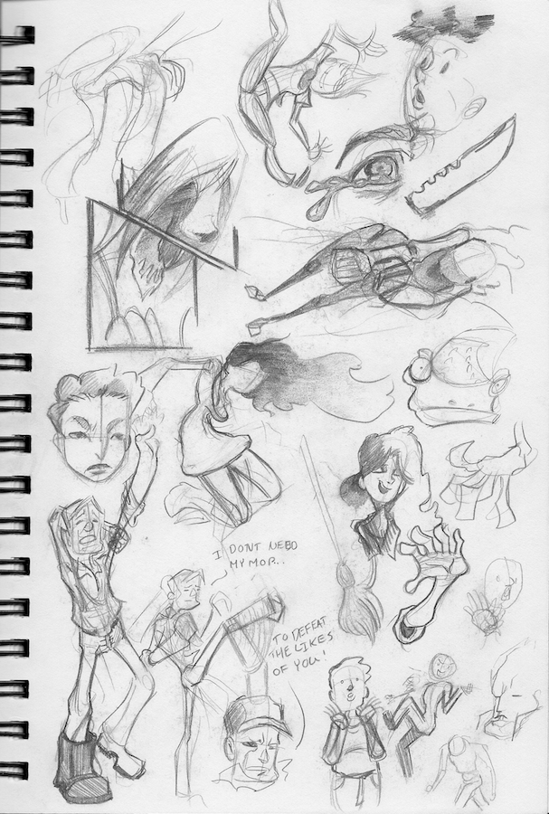 Okay. Now what you should do is to buy a sketchbook. A smallish one that is hard cover, book bound, and full of good, sturdy, bleed-resistant paper. Then buy a pen and doodle the fuck out of it. Bring it everywhere, even if you don't intend to use it, so that it becomes a part of you. Draw things from life and things from your head, and try your best to fill every nook and cranny of every page. Do not move onto another page until the page you are on is full (pic related.) You can't erase because you're using pen and you can not rip any pages out. You don't need to show this to anyone if you don't want to. You can take as long as you'd like to fill it out. I tend to fill a sketchbook every month, but that's just me. Why does this work? Because not only does it preempt excuses for not drawing, it also makes drawing fun again. You draw without a specific subject, allowing yourself more freedom to jump from subject to subject. You lose your need to make everything perfect when your goal is just to fill the page with neat stuff. When you are having fun your art will look better and you will regain confidence. Finally, you will end up being dependent on your sketchbook, and that means you will need to draw. Momentum is a wonderful thing. Pro-tip: if you can get into any venues that play live music (not metal though, great as it is, metal doesn't work for a variety of reasons.) Just make sure you have a table and your sketchbook. Trust me, live music is so much better for drawing than the canned shit, and drawing is more fun when you're not in your room.