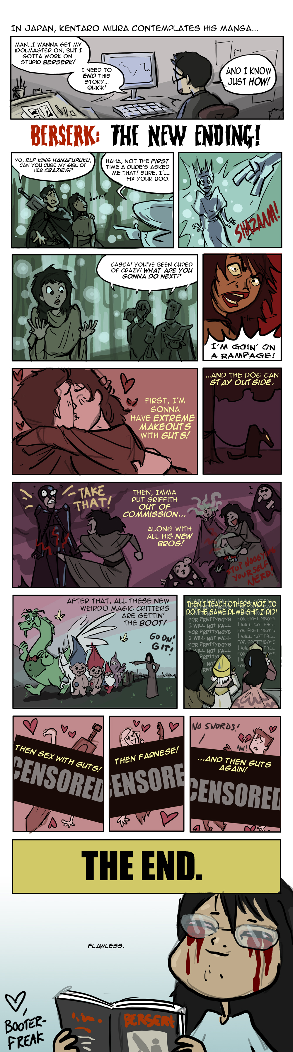 You know, not to toss Mary Sue around, but Griffith, as part of the story, is a Mary sue, like according to how the God of the universe has set him up he is a literal Mary Sue, but he also operates outside that. No one in the "story" according to Skull Knight, can touch, stop or in anyway actually hurt him.