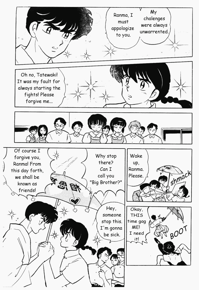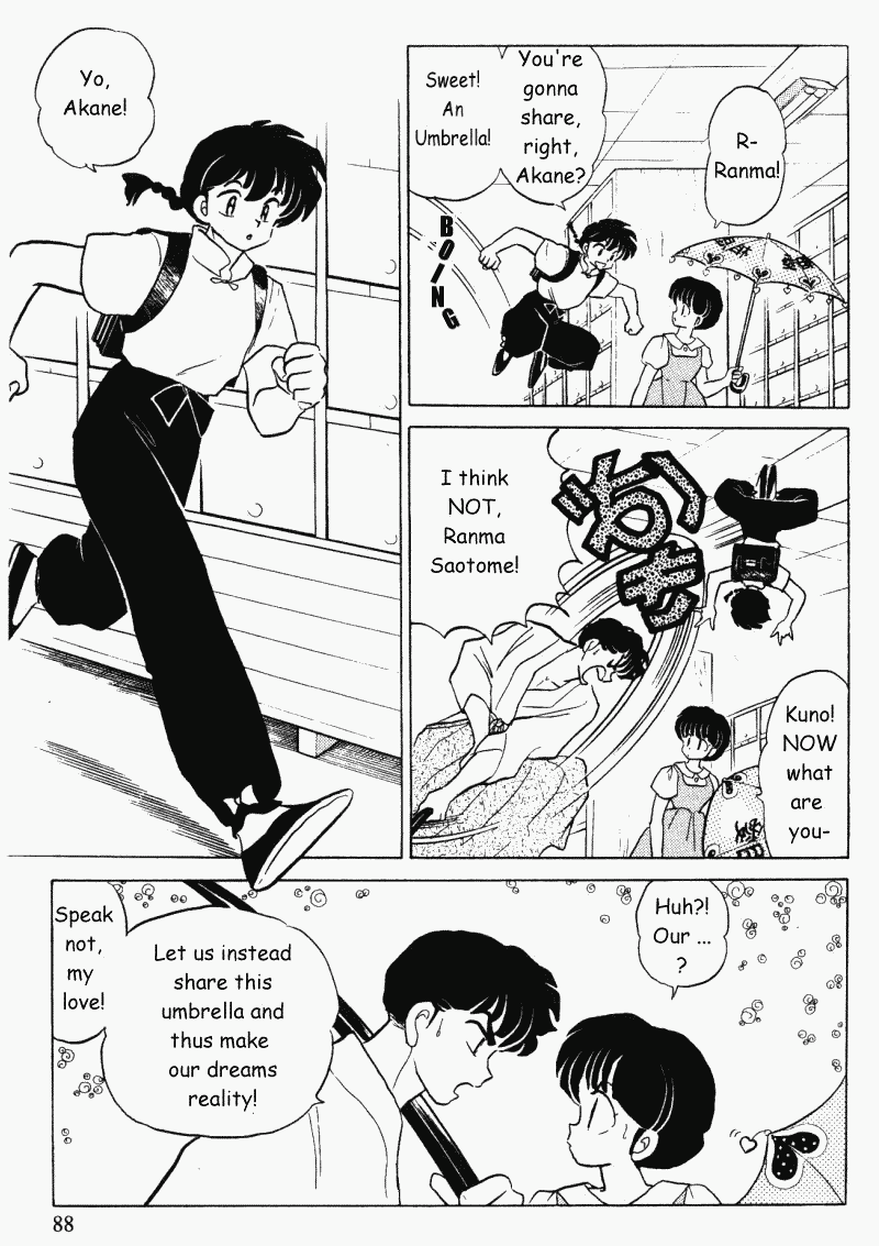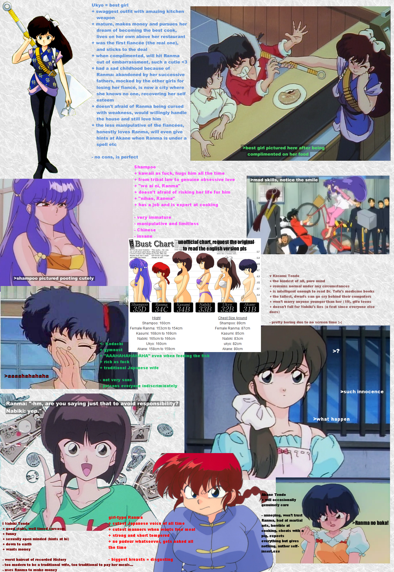 >>80969 That's a lot of assumptions you've made there, buddy, (and a lot of periods, too...) All personal attacks and dubious financial insights aside, however, I'd like to propose that your hatred of Nabiki has less to do with the character and more to do with your deep-seated mistrust of women in general. Let's break this down: Saying someone is better than a "gold digging bitch" is hardly a compliment. Not many people will take it as such. Cologne is old as sin. If she didn't have her own source of income by now, that really would be a problem. Nabiki, however, is not an adult, so I won't hold not having her own cafe against her. Don't you think it's a bit hypocritical of you to assign worth to women based on how much money they can earn you? As for Ukyo, well, she does have the benefit of inheriting the family business. Unfortunately, not everyone works during high school, but that's hardly an unforgivable sin. Mr. Krabs' avarice is exaggerated for comedic purposes. Nabiki's money-grubbing is the same. However, this doesn't make either character "a real bitch." Being able to make distinctions based on genre is a useful skill, but you'll never master it if you go out of your way to find something to hate. It's good that you don't feel sorry for Kuno, but maybe you should cool it with the invectives. Once again, he's a comedic archetype. Also, using the word "faggot" will hardly endear you to most. It certainly won't help convince anyone that you're not some misogynistic cretin.