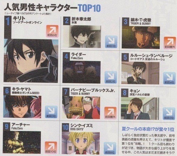 01) *78,671 Bakemonogatari 02) *71,057 Mahou Shoujo Madoka Magica 03) *68,734 Kidou Senshi Gundam SEED Destiny 04) *59,887 Nisemonogatari 05) *58,589 Kidou Senshi Gundam SEED 06) *50,551 Code Geass: Hangyaku no Lelouch 07) *48,571 Fate/Zero 08) *46,146 Macross Frontier 09) *43,883 K-ON! 10) *42,690 Code Geass: Hangyaku no Lelouch R2 11) *41,037 Suzumiya Haruhi no Yuuutsu 12) *39,385 K-ON!! 13) *39,352 Kidou Senshi Gundam 00 14) *36,511 Hagane no Renkinjutsushi: Fullmetal Alchemist (2003) 15) *34,601 Kidou Senshi Gundam 00 S2