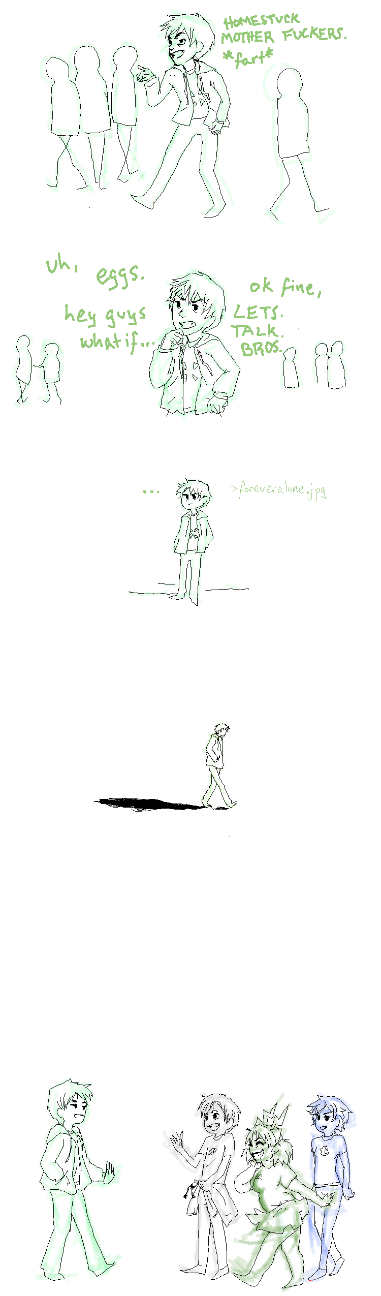 It is the story of the personifications of the 4 biggest Homestuck fanbases (HSG threads on /co/, Tumblr, MSPAF, and DA) playing a game of Sburb together.