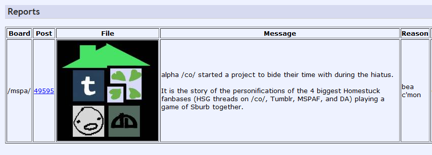 actually no one invited /mspa/ to metastuck because it was only going to have 4 characters (to parallel the kids' session) and the 4 largest groups were chosen. we are actually quite small, and unlike tumblr, 4chan, mspaforums and deviantart, we produce next to no original content, having scared off most of our artists and creative people by being frothing morons almost 100% of the time. it is not the mod's fault you are horrible and have helped to create a community that nobody likes, that is actually on your head. your behaviour at the moment exemplifies exactly why we aren't thriving.