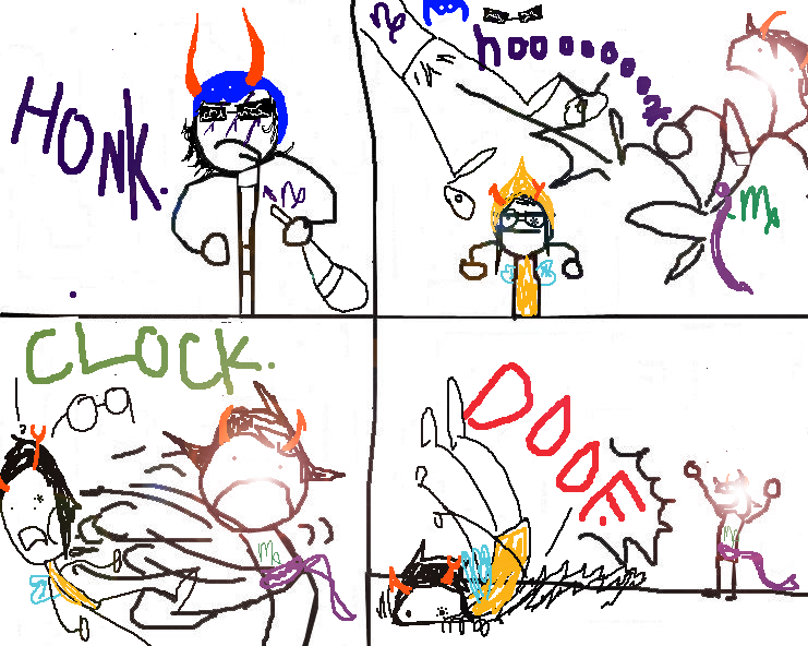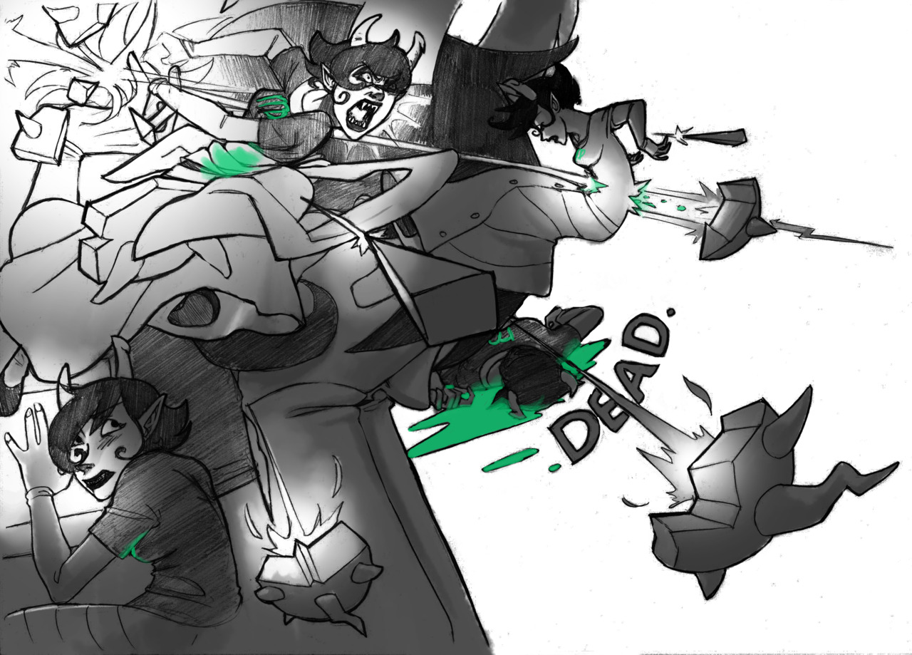 >>60180I love how the blood is ONLY the colors of the dead trolls. Sollux, tavros, feferi, equius, and eridan, and arguably shaded eridan or dependin on when it was drawn, gamzee, because CLOWN HUNTING.